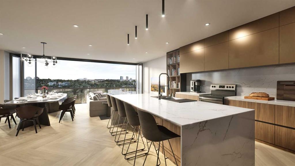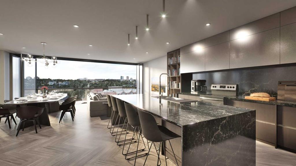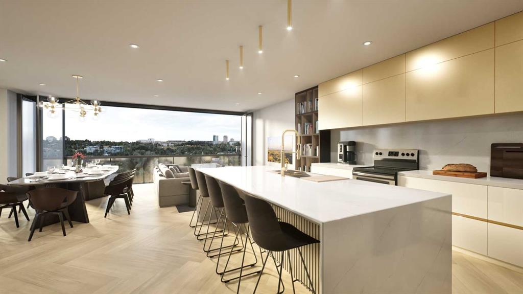 Welcome to your dream single-level residence in the sky overlooking beautiful Kensington at The Kenten. Masterfully designed by architects Davignon and Martin, The Riley is designed to give Calgarians a spacious luxury option for people coming from both a smaller condo or a larger home. As you step in, you are greeted by a direct view of the Kensington valley; floor to ceiling triple-pane windows; a 22-foot-wide living space featuring open concept kitchen, living, and dining, designed to entertain your family and friends. Enjoy a gourmet kitchen with gas range, custom millwork, built-in pantry, and fireplace that all flow towards your opening wall system onto a large terrace overlooking Kensington. The large primary bedroom has balcony access, a large walk-in closet that can be converted to partial storage, and a 5-piece ensuite bathroom with a floating tub and heated floors. The second bedroom comes with a built-in murphy bed and a glass wall separating the office area. An additional bathroom and laundry room complete the residence accompanied by 2 bike racks, 2 titled storage lockers, and 2 titled parking stalls. There are 3 modern palettes to choose from that can be further customized to your liking. The Kenten features over 8,000 square feet of amenities including a sky lounge, gym overlooking Kensington, golf simulator, sauna, hot tub, concierge, guest suites, car wash, and more. Explore a simplified lock and leave lifestyle you didn't know was possible, with 250+ shops and restaurants in Kensington and river pathways stemming from one end of the city to the other. Now preselling, our show suite is open for viewings by private appointment. With only 42 residences, don't miss this once in a lifetime opportunity to live at the most interesting corner in Calgary.