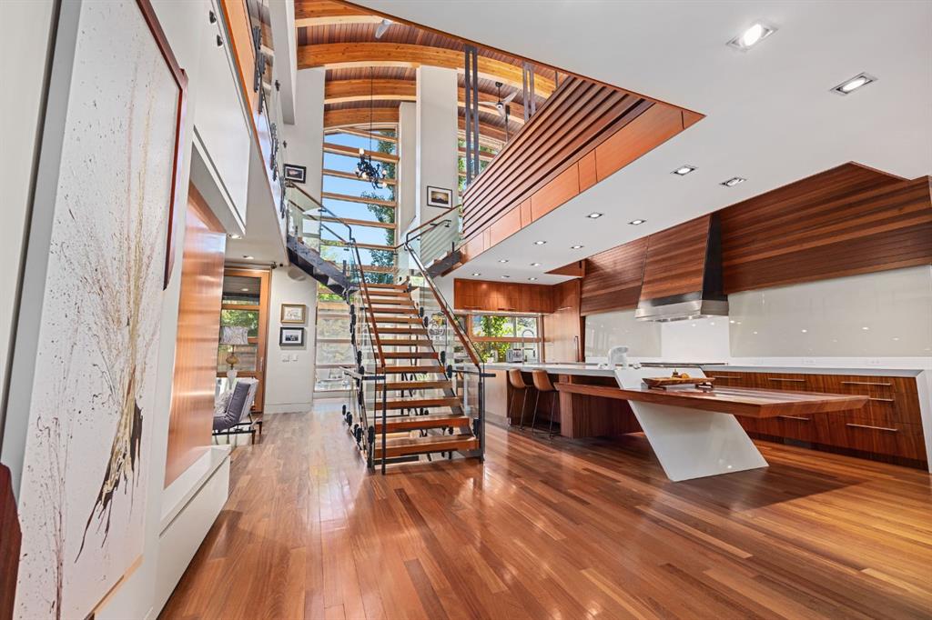 An opportunity of a lifetime! Movie motion picture meets real life masterpiece in this opulent home that took years to design and build utilizing renowned architects Dejong Studio and builder Triangle Enterprises. Upon entering the home you are awed by a grand, overbuilt, wrought iron and glass staircase which serves as a divider for the warm living room and the massive chefs kitchen complete with top of the line appliances. An expansive island lends to entertaining while serving as hidden storage, intricate woodwork and a stunning layout must be seen in person to be truly appreciated so feel free to tour noting the impeccable attention to detail throughout. Walk upstairs and you will notice stately handcrafted bookshelves en route to the west facing open air office space. Natural light emanates from all directions due to the large, refined windows. Come see for yourself the moving walls, gym space for the athlete in your family, glass floors, and a floating lounge. Gigantic space abounds complemented by mahogany clad walls, clean lines, custom cabinetry, a copper roof on both the home and garage along with heated flooring on all three levels providing comfort and elegance combined with functional living. For those interested, please inquire further as I would be happy to relay how this engineering marvel operates. Two gracious bedrooms on the second level with en suite baths with two more large bedrooms on the lower lever, accomodating anyone from empty nesters to families aspiring to divide living quarters for maximum privacy. The east facing, glass enclosed patio overlooks the backyard, an outdoor shower, and a heated garage equally as elegant and equipped as the home. Park your cars or work on that project you are passionate about while organizing tools and sports equipment via the built in storage system. If you desire a space that melds art and sophistication with functional living, this is the home for you! Rideau Park is centrally located within the city of Calgary and this one of a kind home is mere steps from shopping, entertainment, schools, the river and multiple parks. Treat yourself with inspiring views both inside and outside, while imagining how fortunate you are to have chanced upon this luxury property.