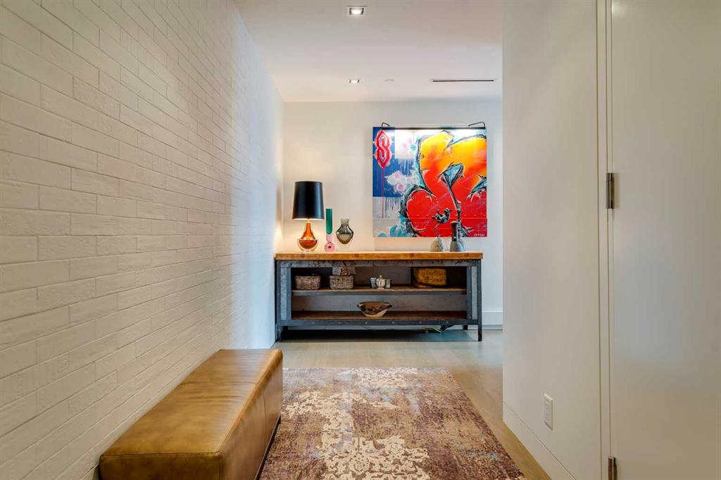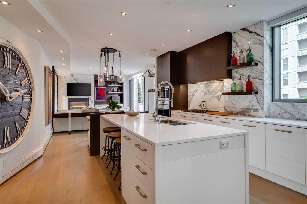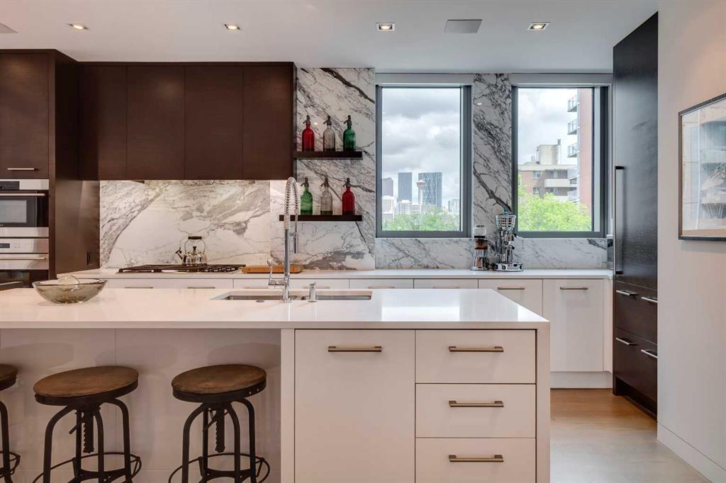 When only the very best will do…“The River” is Calgary’s undisputed top-luxury-condo destination. An exclusive collection of just 38 residences with incredible amenities including a full-time concierge. and fitness. Located in Mission, on the banks of the Elbow River and adjacent to the 4th Street Village with top restaurants, bars, cafes, shopping and services. The walk score is incredible! Suite 310 is the smallest unit in the main tower…in the NW corner with easy access to concierge and amenities including the fitness centre. The suite is 1236 square feet with one bedroom, 9’ ceilings, huge windows and a 300+ square foot terrace that runs the full length of the suite. Incredibly high level of finish throughout. Douglas Cridland Interior Design completed some carefully tailored improvements. Bright open-plan including a living space with fireplace and terrace access, a bright dining space with Holly Hunt chandelier, and a chef’s dream kitchen with Downsview cabinetry, Subzero and Wolf appliances, huge island and downtown views. The beautiful primary bedroom offers bespoke paneling and millwork, downtown views, terrace access, a walk-in closet, and a gorgeous marble-clad 4-piece ensuite bath with steam shower. Generous laundry room and a 2-piece powder room. 2 very prime parking stalls with storage rooms at the head of each stall. Guest suite for the building is right next door (offering a 2nd bedroom when you need it). A very rare offering in the best condominium in Calgary…