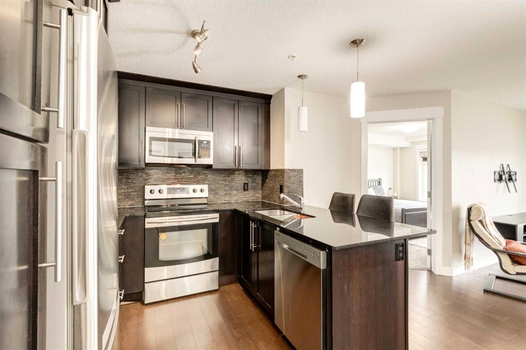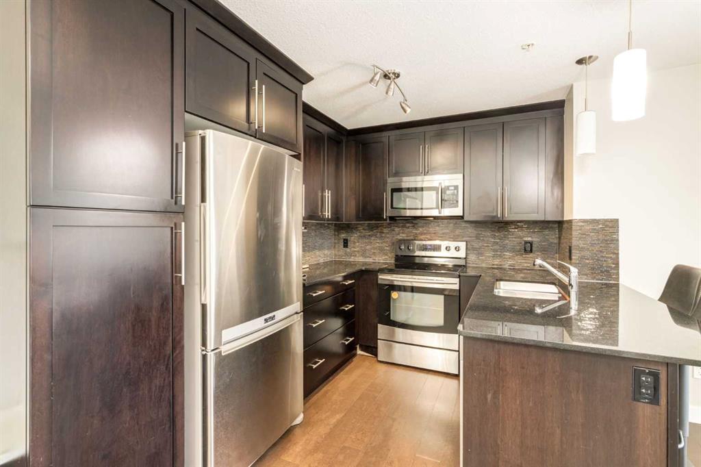 PRICE REDUCED! Call Your Favourite Realtor! Discover this delightful and spacious condo boasting 2 bedrooms and 2 full bathrooms. Nestled in a prime and highly sought-after location, this north-facing suite offers expansive views through large windows. Situated conveniently close to shopping, transit, schools, medical facilities, and entertainment, this complex meets all your needs! With over 800 sq ft of living space, this condo features one of the most favoured layouts in the building. The main living area is bright and open, showcasing a generously sized great room with patio doors leading to a covered 10' x 6' balcony—perfect for outdoor BBQs! Enhanced with cork floors and modern fixtures, the living area is both stylish and comfortable. The kitchen is a chef’s delight, featuring dark stained maple wood shaker-style cabinets that extend to the ceiling, granite countertops, a garburator, an over-the-range microwave/hood fan, an eating bar peninsula, and upgraded stainless steel appliances. The spacious primary bedroom includes a walk-through closet leading to a private ensuite bathroom. The second bathroom features an upgraded soaker tub, adding a touch of luxury. Additional amenities include in-suite storage and a laundry room. The condo also comes with an indoor parking stall complete with a full storage cage for added convenience.