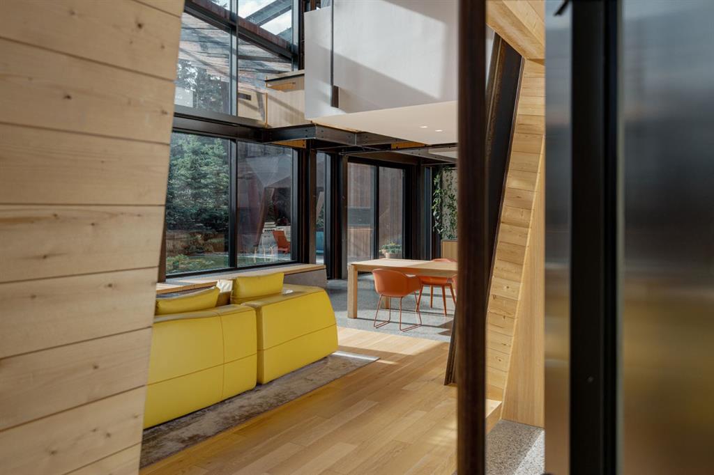 Nestled in Calgary’s Mount Royal neighbourhood, Montreal House is a testament to innovative architectural re-imagination. Conceived by renowned Calgary architect Jeremy Sturgess, this home harmonizes with its environment while challenging conventional design. The home features a continuous flow of living spaces that encourage interaction. A series of 18 cantilevered glulam beams provide solar shading for the west-facing windows, supported by a steel structure to prevent uplift. The home's steel frame enables a structural expression that would not have been possible with conventional construction methods. The extensive use of Kayu Batu cladding promises a stunning transformation as the wood weathers to silver, contrasting the evolving Corten steel. Double-height ceilings and carefully situated private areas balance openness and intimacy. The folded carapace roof shields from the east and opens the interior to the western garden, creating an urban courtyard. The narrow, linear form of the house opens to a sunlit western yard, preserving the neighbourhood’s character with mature trees on site. The house’s layout maximizes privacy with east-facing bedrooms that greet the morning sun and a screened entry set back from the street. The sculptural Corten steel fireplace bridges the indoors and outdoors, reflecting the material’s weathering over time. Raw steel and structural CLT panels narrate the structure's aging in place, poetically contrasting unchanging concrete elements. With subtle steel-to-CLT connections, this precise engineering ensures structural integrity and clean aesthetic lines. Montreal House expresses architectural experimentation and environmental harmony, promising an ever-evolving dialogue between materiality and design. Awards: 2020 World Architecture Festival, Finalist – House & Villa – Completed Buildings 2019 Prairie Wood Design Awards, Jury's Choice 2019 Canadian Institute of Steel Construction, Alberta Steel Design Awards of Excellence