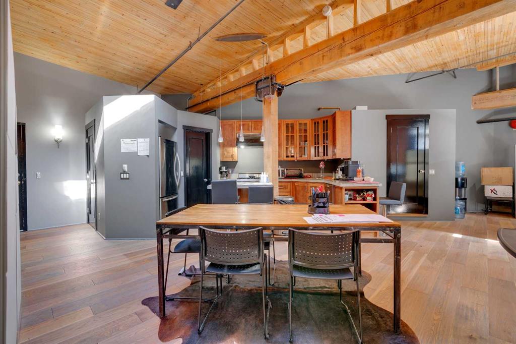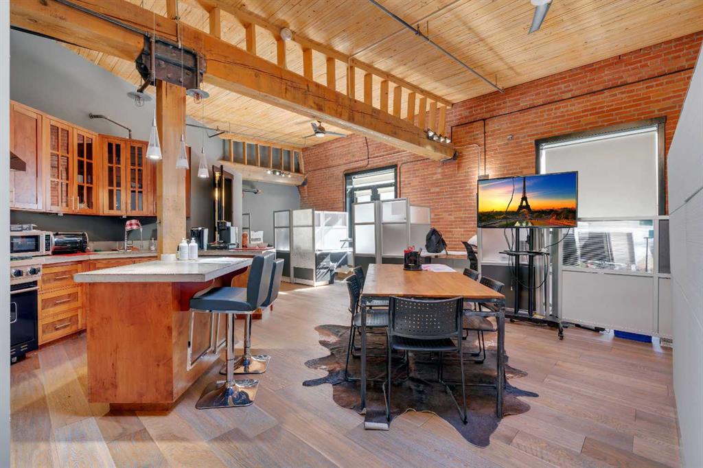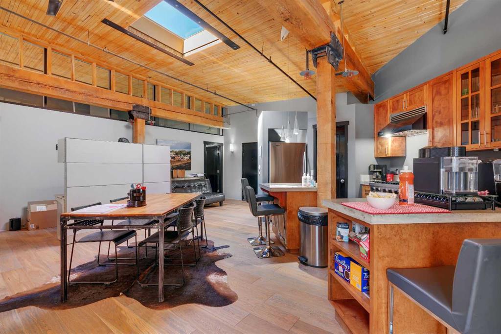 Indulge in a captivating fusion of historic allure and modern sophistication in this exceptional penthouse located in the vibrant Beltline district. Set within the renowned Hudson Building—one of the city's first loft conversions—this residence harmoniously merges classic character with contemporary luxury. The spacious, open floor plan highlights the penthouse’s rich heritage through original Fir wood ceilings, dropdown beams, and exposed brick and piping, while seamlessly integrating modern finishes. Natural light floods the space through a sunny skylight and numerous windows, creating a warm and inviting atmosphere. The gourmet kitchen is a chef's delight, equipped with stainless steel appliances, a Viking gas stove, a Miele dishwasher, concrete countertops, and custom cabinetry. The central island is perfect for casual dining and adds to the kitchen’s appeal. This versatile loft is one of the rare buildings which allows for both residential and professional use. It offers ample space for a comfortable living area and a spacious dining room for entertaining, or it can be configured as a functional workspace with room for cubicles and a central meeting area. A convenient 2-piece bathroom caters to guests, employees, or clients. The generously sized bedroom provides a serene retreat or an impressive office space for business owners, complete with a luxurious ensuite with tub and shower and a walk-in closet. French doors lead to a Juliet balcony, inviting fresh air and natural light. Additional features include a titled underground parking stall (#34) and extra gated surface stalls available for lease ($275/each). The building also offers extra large storage lockers and a common area with a gym. Located just blocks from the trendy 17th Ave and downtown core, this penthouse provides an unparalleled inner-city experience.