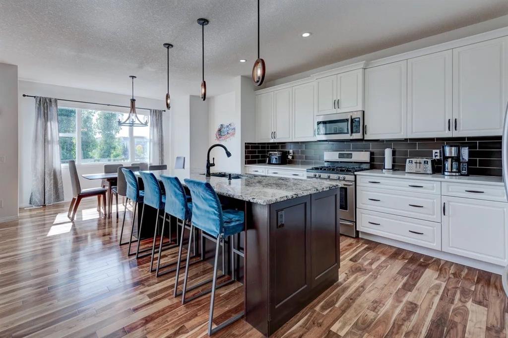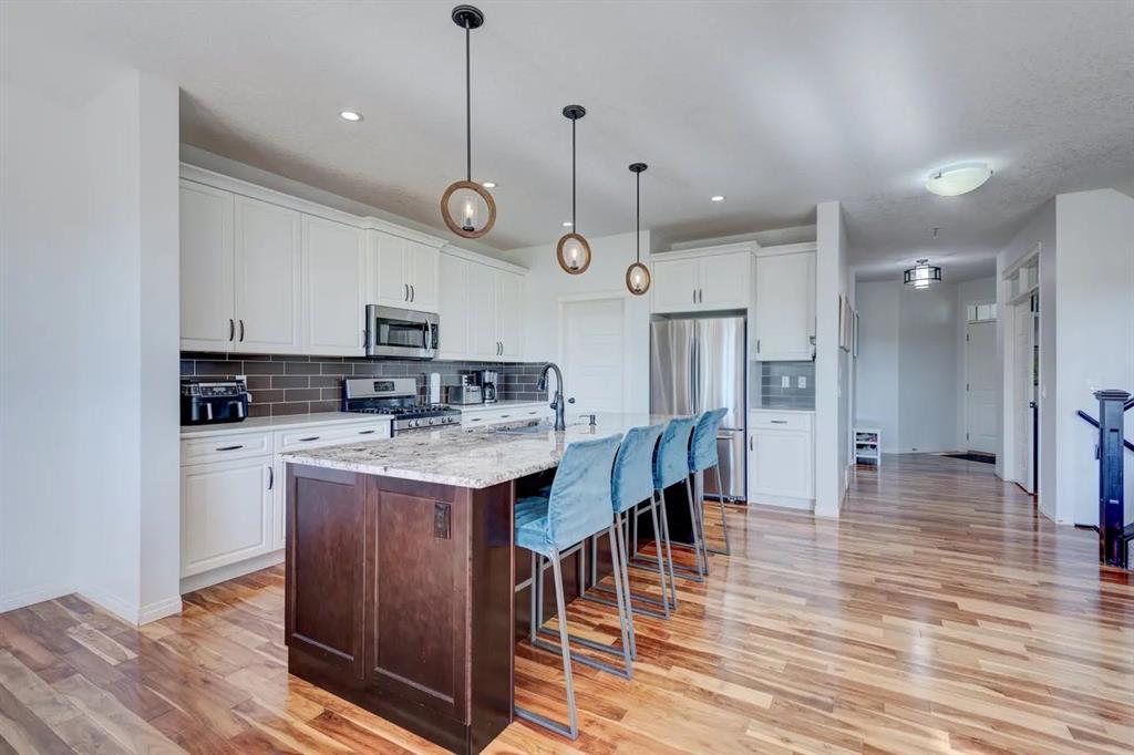 Don't miss your opportunity to own this one-of-a-kind property - Welcome to your exceptional family retreat in Auburn Bay, Calgary’s premier lake community offering year-round recreation from swimming to ice skating. Nestled on a quiet cul-de-sac, this home boasts one of the largest pie-shaped lots in the area, featuring breathtaking pond views, direct park access, and a backyard oasis. Thoughtfully designed to satisfy every family's needs, including, a fully finished walk-out basement, and upgrades throughout, this home is a rare gem. Upon entering, you’re greeted by a bright, open-concept main floor that draws you into a modern farmhouse kitchen. This chef’s space features expansive granite countertops, tropical acacia hardwood floors, and ample cabinetry, making it as practical as it is beautiful. The oversized island invites family gatherings, while the dining area is framed by floor-to-ceiling triple-paned windows showcasing serene views. Step out onto your extra-wide deck with a louvered roof, perfect for shade on sunny days. This deck is the ultimate relaxation spot for enjoying your private view over the expansive yard and pond. The upper level is perfectly laid out with three large bedrooms, upper floor laundry, and a spacious bonus room. The primary suite is a personal retreat with a spa-inspired ensuite that includes dual sinks, a soaking tub, and a large walk-in closet. The fully finished walk-out basement expands your living space, offering a bright and inviting family room with a wet bar, ideal for movie nights and entertaining. A full bathroom, extra bedroom, and extra storage space complete this versatile area, which leads directly to the backyard. Outside, the backyard is a true paradise, designed to be both beautiful and functional. With nearly triple the size of a standard lot, this space is perfect for family enjoyment and relaxation. It includes cedar-raised garden beds perfect for satisfying your inner gardener. The custom firepit patio is a cozy spot for gathering with family and friends, while a tiered bed offers even more planting opportunities. An efficient three-zone irrigation system ensures easy maintenance, while two additional sheds provide storage for all your outdoor tools and seasonal items. This home also features an AC system adding to its comfort, Hunter Douglus blinds thought, stunning Gemstone lights and a 40 Amp electric vehicle panel in the garage. Auburn Bay offers outstanding community amenities, including exclusive lake access, a community centre, parks, and highly rated schools (conveniently located within walking distance) making it a truly family-friendly neighbourhood. Don’t miss this rare opportunity to own an expansive, stylish home with unmatched views and outdoor space in one of Calgary’s most desirable lake communities. This one won’t last—schedule your viewing today and see it for yourself!