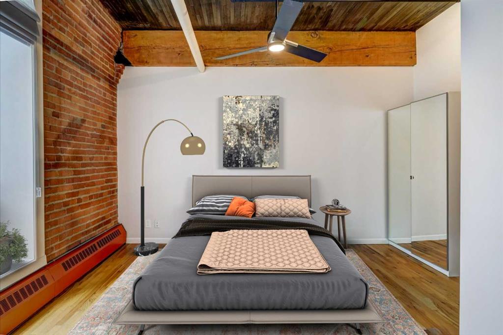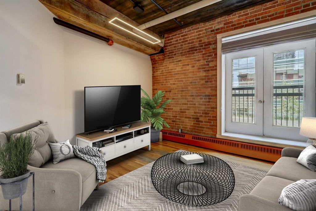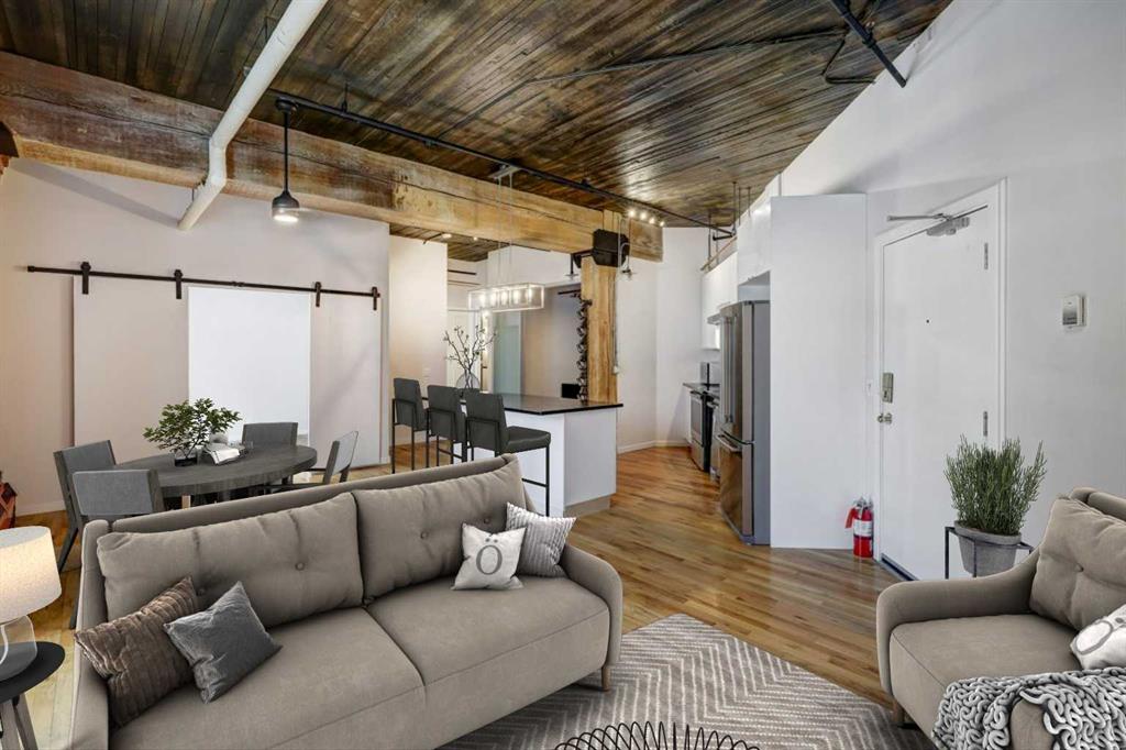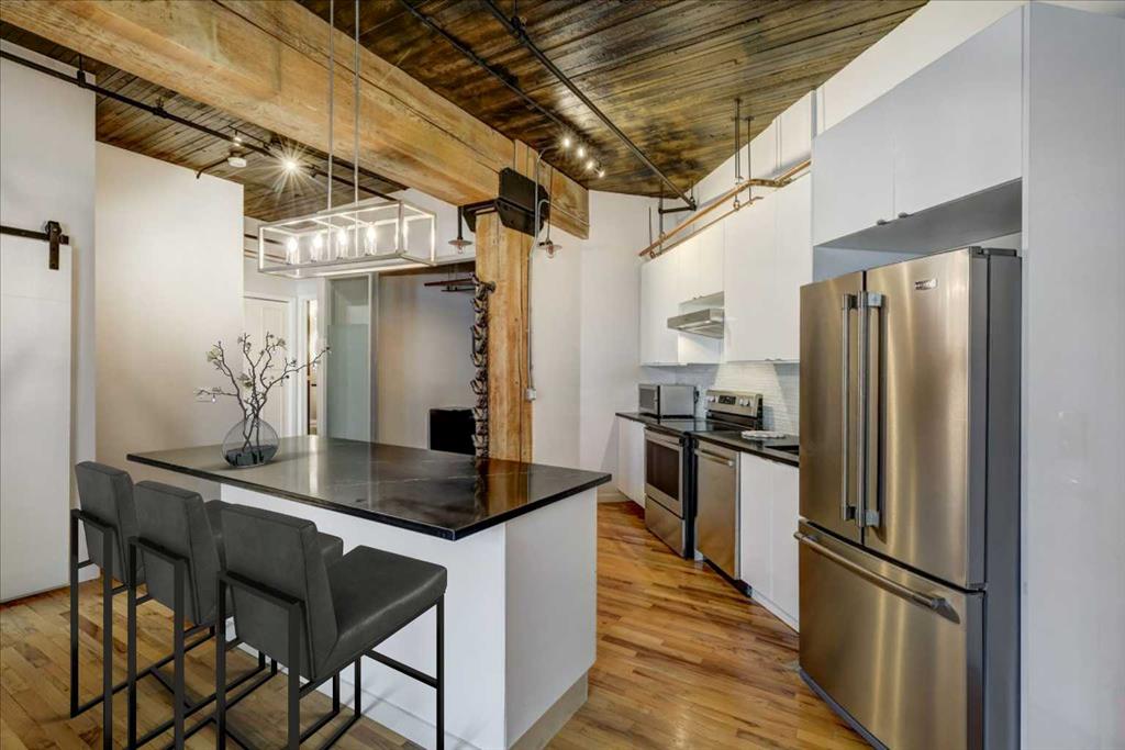 REDUCED $38K - SELLER MOTIVATED! Rare loft living opportunity in The Hudson – a historical and hip building with a unique mixed-use commercial/residential zoning, ideal for live/work or can accommodate a small commercial office/practise. Originally built in 1909 as storage/warehousing for the Hudson Bay, the historic building underwent an extensive conversion in 1994 to residential/commercial lofts. Featuring exposed brick walls, 11’ ceilings with massive fir beams, hardwood floors, Juliet balcony and exposed copper plumbing/ductwork – this unit has immense character contrasted with modern finishes and conveniences: LED lighting, open floor plan living area with island kitchen and gloss white cabinets with black stone counters and glass backsplash, stainless appliances, barn doors leading to primary bedroom, sliding glass doors on the den/office which may be used as a second bedroom due to sprinkler system, plus an upgraded 4-piece bath and in-suite laundry. Comes with a generously sized separate storage unit (approx. 7’ x 8’) and a titled, secure underground parking stall and Telus fibre in the building assures high-speed connectivity. This is urban living at its finest, located in the heart of the Beltline on 10th Avenue, just steps to the Calgary’s downtown core, restaurants, eateries, shopping, parks and amenities. Check out the ***virtual tour*** - you must see this property to really appreciate it!