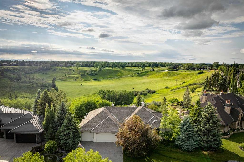 Welcome to this stunning bungalow nestled on the ridge of Canyon Meadows Golf and Country Club overlooking Fish Creek Park. This custom-built architectural gem awaits empty nesters seeking their dream home. From the captivating curb appeal with lush landscaping and mature trees to the inviting arched portico leading to the front door, every detail speaks of meticulous craftsmanship. Upon entry, natural light floods the space through large windows, illuminating beautiful hardwood floors that guide you to the formal living room. With its soaring coffered ceilings and a fireplace flanked by display shelving, this room exudes warmth and elegance. Meticulously designed archways create an effortless flow through the open yet intimate spaces, perfect for entertaining. The adjacent dining area features a convenient wet bar, ideal for preparing drinks and a built-in credenza for your collection of linens & dinnerware. A spacious gourmet kitchen boasts glass fronted cabinetry, high-end appliances, a large pantry, and a butler's pantry making this a space able to accommodate family meals as easily as a formal catered dinner party. Sip a coffee in the sunlit dining nook or step out onto the sprawling wrap around west-facing deck with retractable awnings to take in the breathtaking views of the golf course and Rocky Mountains. The large primary bedroom offers a serene sanctuary with a fireplace, walk-in closet, and a luxurious ensuite featuring dual vanities. Completing this level is a sizeable laundry room attached to the mudroom room and a quiet den perfect for working from home. Descend to the walk-out level to discover a spacious recreational room perfect for a pool table, complete with a double-sided fireplace that also warms the adjacent family room—a cozy haven for movie nights. The wet bar and wine room make this floor a fun space for entertaining friends and family. Two bedrooms—one with a private ensuite powder room and the other with access to the bathroom—provide comfort and privacy for guests or visiting family members. This home offers ample storage, and a three car garage. Outside, the landscaped backyard unfolds as a secluded oasis enveloped with mature trees and flower beds, offering tranquil views of the fairways, Fish Creek Park & the Rockies in the distance. Whether you're savouring warm summer evenings with loved ones or relaxing in the sunken hot tub on chilly winter days, this space invites year-round enjoyment. This elegant retreat will not disappoint.
