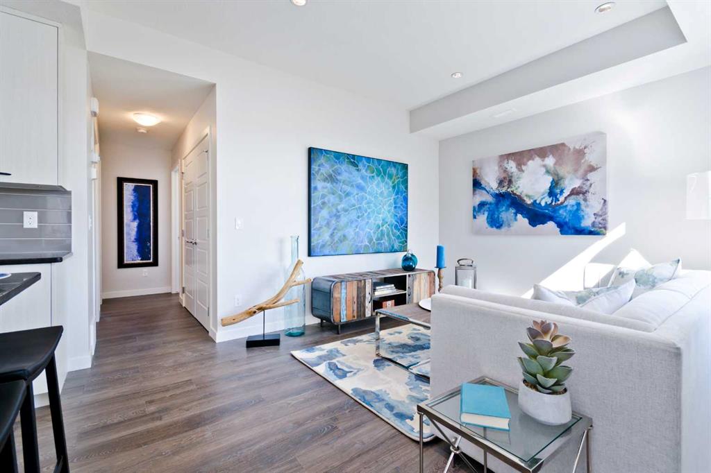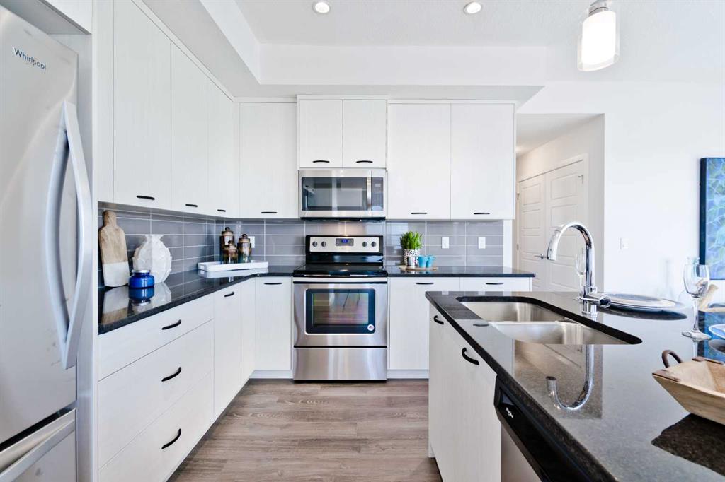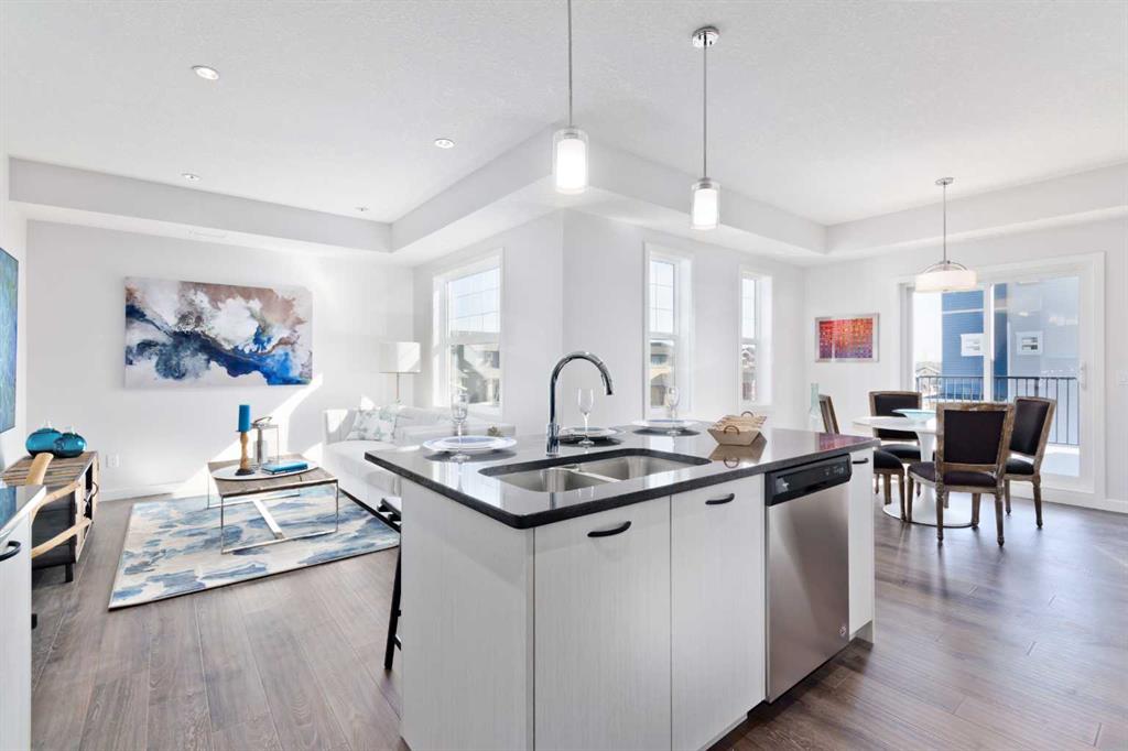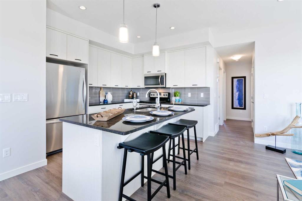 Genesis Builders Group in Newport Landing presents this tastefully designed 2-bedroom, 1-bathroom townhome with an attached garage and additional parking stall. Boasting 9' ceilings and a spacious open-concept floor plan, you will find comfort and functionality. The kitchen is well equipped with full-height cabinetry, sleek stainless steel appliances, stone countertops and an island with additional seating. The spacious dining room is perfect for hosting family and friends, while the cozy living room allows you to unwind in comfort. The primary bedroom will be your retreat, where you can easily accommodate a king-size bed, and there are no compromises to be had with the spacious walk-in closet. The second bedroom functions well as a kid's room, room for guests or a mortgage helper roommate. A 4-piece bath compliments this unit, and you can add a washer and dryer in the conveniently located laundry space. The generously sized attached garage provides ample parking space and storage for your odds and ends. Stepping outside, you have a desirable spacious rooftop patio located above the garage. Newport Landing is a quiet complex surrounded by beautiful homes and walking paths. This is one of the final units and is a rare find. You won't want to miss out on this opportunity to make it yours. *Photos are from another unit and colours may vary*