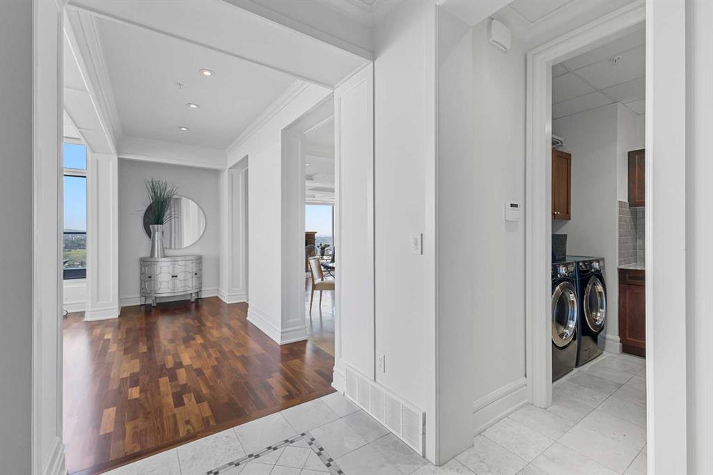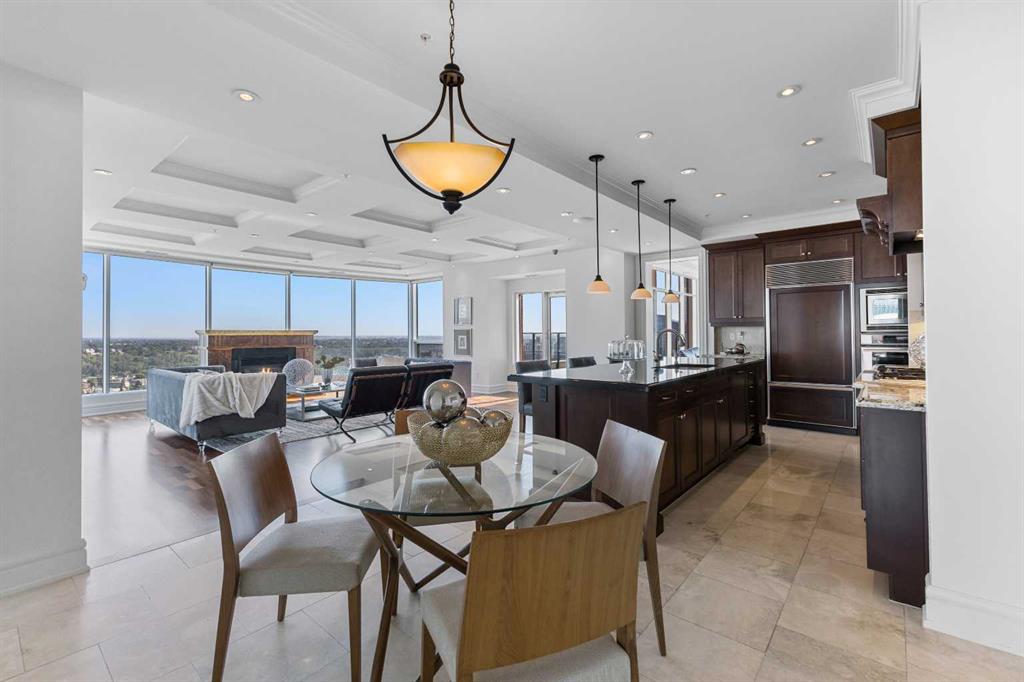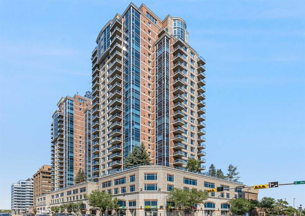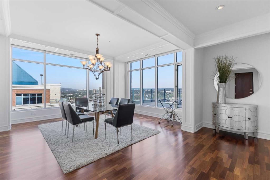 Welcome to Five West, a safe and secure complex in the heart of downtown Calgary. This executive built air-conditioned penthouse has been recently painted throughout and boasts spectacular views of the Rocky Mountains and Bow River. With over 3000sqft of living space, you can enjoy the bright and open floor plan. Upon entry, you'll be met with a formal dining room with coffered ceilings and gorgeous mountain views. The gourmet kitchen comes equipped with granite countertops, a breakfast eating bar, stainless steel appliances, and a walk in pantry. The kitchen opens up to the large great room with breathtaking views and a cozy gas fireplace. Entry to the 2 balconies are through the great room, one on the West side and one on the East side. A spacious family or flex room is just off of the great room, leading into a den, perfect for a home office. The second bedroom can be found on the East side of the unit with a walk in closet and a and a 3 piece ensuite. The west side of the unit boasts a large primary bedroom complete with full length windows and a huge walk-in closet. The 6 piece spa like ensuite has a large jetted tub, oversized steam shower, and convenient heated towel bars. The unit is complete with a 2 piece powder room and a large laundry room. Enjoy the convenience of having 2 titled, underground parking stalls and an assigned storage locker. The building has been well looked after and is very safe and secure. Pride of ownership is evident throughout the unit. Located within walking distance to multiple amenities and transportation. Exceptional value!