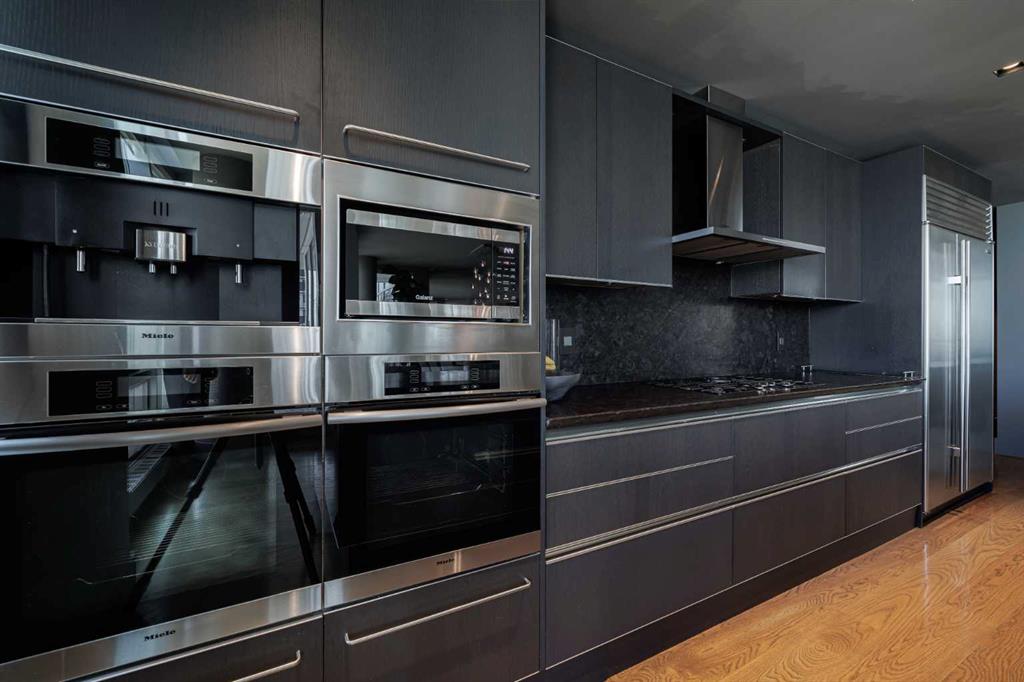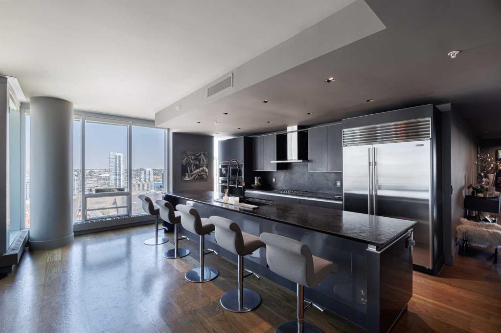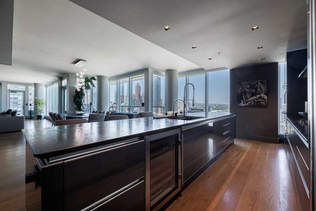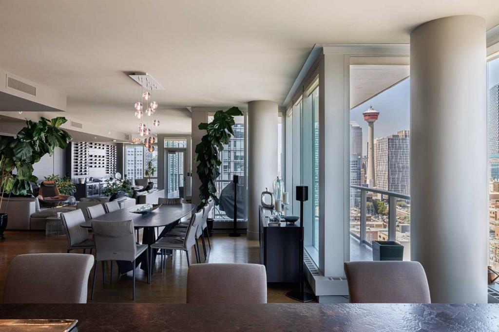 Experience the pinnacle of luxury living in this dream condo, perfectly located in downtown Calgary! With incredible panoramic views of the city skyline and surrounding landscape, this exquisite residence boasts 58 windows offering stunning North, East, and West perspectives. The open floor plan, complemented by rich hardwood flooring throughout, creates a seamless flow between spaces. Arrive in style with a semi private elevator that opens directly into the expansive living and dining area, where you’ll immediately appreciate the elegance and sophistication of this rare gem of a home. The state-of-the-art kitchen is a chef's paradise, featuring a Sub-Zero refrigerator, an expansive Bruno Perla Leathered Granite Island with breakfast bar seating, gas cooktop, and a Miele double oven, Sub-Zero drink fridge and a Miele built-in coffee maker, ensuring every culinary need is met with ease and luxury. Seamlessly flowing into the dining space you will notice the custom Bocci chandelier and abundance of light streaming in through the stunning floor to ceiling windows. Sitting adjacent to the dining room, is a fully upgraded 2pc powder room. The living room provides access to the dual balconies equipped with a gas BBQ, perfect for entertaining while taking in the breathtaking views. The built-in shelving provides both functionality and style, adding to the room's refined atmosphere. Adjacent to the living room is a sophisticated seating area, complete with built-in Vin de Garde’s luxury wine racks and glass cabinetry, offering an elegant space for drink connoisseurs. The Legrand electrical updates and modern lighting allow you to set the mood for any occasion. Moving to the East wing, the primary suite is a private sanctuary, featuring double walk-in closets with custom built-ins and ample hanging space. Enjoy direct access to a third balcony, perfect for morning coffee or evening relaxation. The 5-piece luxurious ensuite bathroom is a spa-like retreat, featuring a soaking tub, dual vanity, stand-alone shower, and a private water closet. A secondary bedroom complete with custom built-ins and a 3pc ensuite is perfect for hosting guests and accommodating any home office needs. For added convenience, the laundry room is designed with custom built-ins and a Raven Quartz counter above, providing additional storage and workspace. Furthermore, three titled parking stalls side-by-side and an assigned storage locker are included for your convenience. Feel safe and secure with 24/7 security personal onsite. Meticulously maintained, this home perfectly blends modern elegance with functional design, offering a lavish urban lifestyle in one of Calgary's most sought-after locations. Pride of ownership is seen throughout.