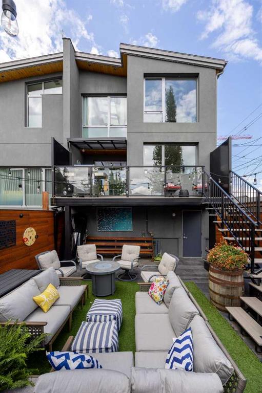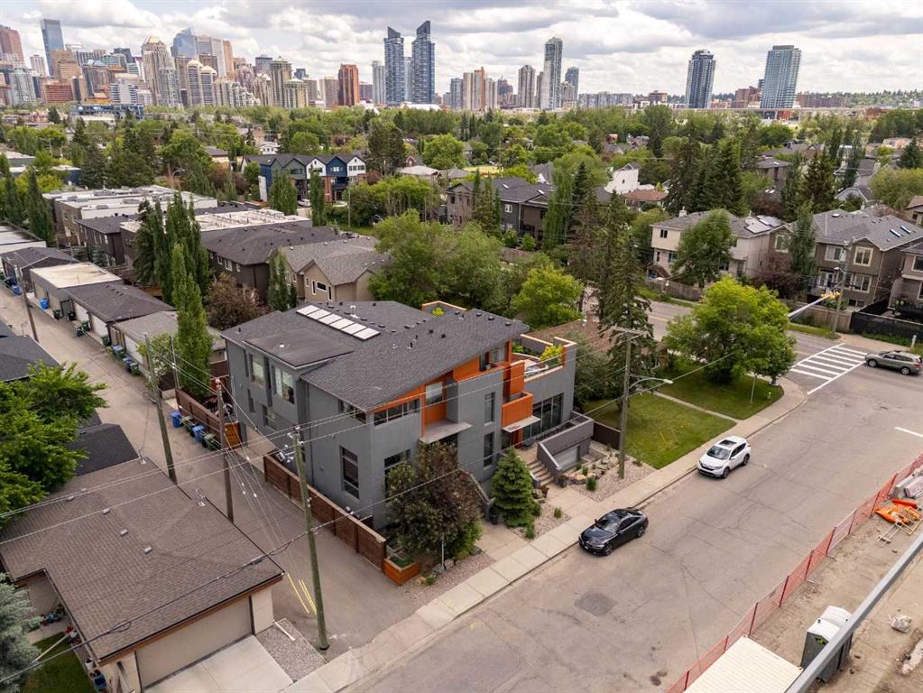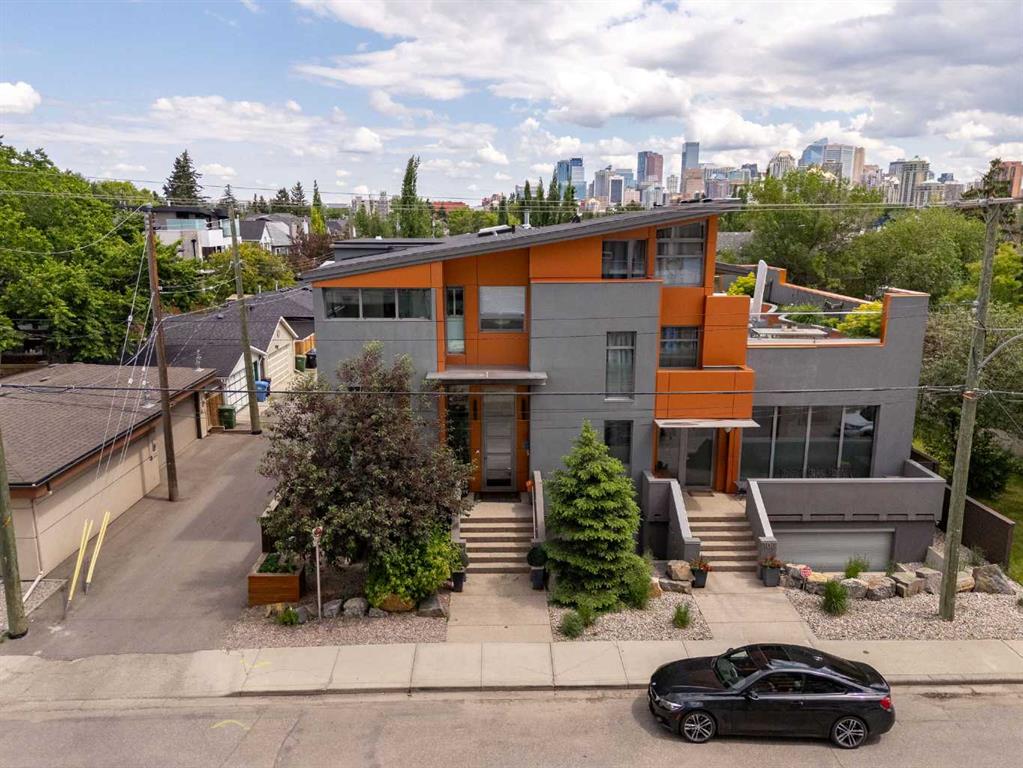 Welcome to this beautiful and unique semi-detached home located in the inner-city community of Hillhurst! This home offers 3 BEDROOMS + OFFICE/FLEX SPACE, 4 BATHROOMS, and over 2,680 SQFT of livable space. This contemporary architect-designed home includes exceptional features such as commercial-grade steel frame door casings, steel reinforced construction, and custom European windows. This is truly a one-of-a-kind residential build! As you enter the home, you are greeted by the 14ft high ceilings and an abundance of natural light from the large windows on all sides. You will quickly notice the gorgeous open-riser steel staircase with 10mm tempered glass connecting from the living room and as you walk up the bi-level stairs to the kitchen area. In the kitchen, you will find extra high-end cabinetry for all your storage needs, beautiful applicates, a kitchen island and a huge window above the sink with downtown views. There is a newly added deck off the kitchen that will lead you to your private backyard, perfect for entertaining your friends and family! The backyard includes a beautiful cedar fence, lighting, and is fully landscaped to include planter boxes and mature trees. Walking up the open-riser stairs to the second floor you will find SEVEN beautiful SKYLIGHTS and more city views from the bonus space which can be used as a gym/office/movie space. The second floor includes 3 bedrooms, 2 bathrooms and the laundry room. The master ensuite includes a soaker tub, a steam shower and a large rainfall shower-head, and double vanity. Heading down to the basement you will pass the attached HEATED DOUBLE GARAGE. The basement includes a modern fireplace and epoxy floor that is heated, perfect for keeping cozy on cold nights! The basement includes a full bathroom which was recently redone to include a shower and there is also an additional flex room. Perfectly located in Hillhurst and a short walk to Kensington where you can find Calgary’s best restaurants, bars and shopping. Great proximity to the river and pathways, downtown, great schools and hospitals. Book a showing with your favourite realtor. This home will not disappoint!