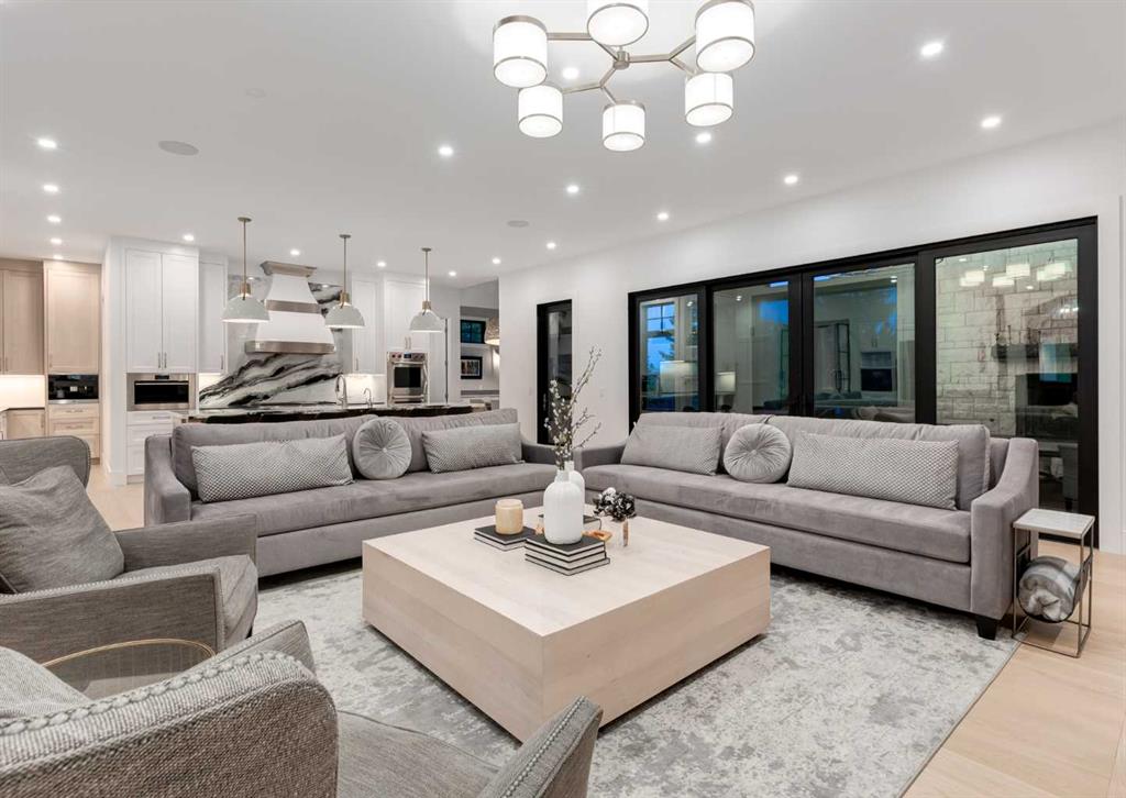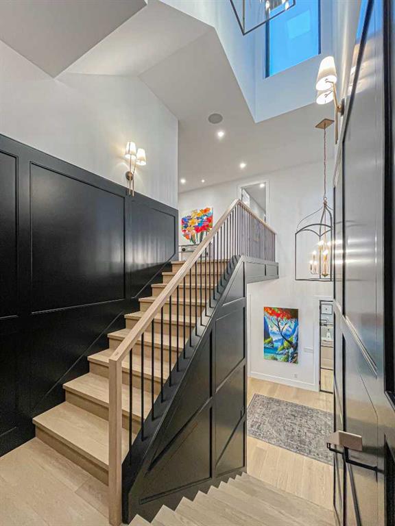 Welcome to this prestigious custom home of true craftsmanship in Britannia, located steps away from the renowned Calgary Golf & Country Club. This dream property offers luxurious living spaces and remarkable amenities. Prepare to be captivated by the ease of lifestyle and unparalleled living experience this property will provide. The grand foyer features two-story ceilings, an opulent chandelier, and ample hidden storage. The impressive staircase with wood detailing beckons exploration across four levels. Convenience is ensured by the spacious elevator connecting the 4-car garage to the fourth-floor entertainment space. This home boasts 5 bedrooms, all with ensuite bathrooms, totaling 10 bathrooms in this home for ultimate comfort and privacy. Spanning over 7,600 square feet, this custom build exudes refined ambiance. The main level showcases an open concept living room and kitchen with white oak flooring and custom cabinetry. A stunning fireplace and built-in cabinetry make the living room perfect for relaxation and gatherings. The gourmet kitchen is a literal chef's dream, equipped with both gas and induction ranges, 3 dishwashers, pot-filler faucet, double ovens, 2 refrigerators, a large island with seating, and a butler's pantry with a food prep area and deep freeze. The built-in Miele espresso/cappuccino machine ensures you can enjoy your own at-home cafe experience whenever you desire. Indulge in the pleasures of wine with the temperature-controlled, on-demand dispenser conveniently located in the living/kitchen area. Entertaining is effortless with a formal dining room that leads you to a secret living room with a fireplace - a cozy hideaway for after dinner relaxation. An informal dining area next to the kitchen offers additional seating options. Large sliding glass doors open to the outdoor living area, complete with a grilling kitchen and wood-burning fireplace. The backyard oasis includes a paved driveway, green space, and a custom hot tub area with shower, bathroom, and laundry. The second level comprises four bedrooms with ensuites, a laundry room, and ample storage. Included here is the primary suite offering luxurious amenities such as a fireplace, wet bar, and spacious ensuite and closet. Going up to another floor is a space designed for ultimate entertainment - a family room, wet bar, patio, and outdoor kitchen with stunning views of Calgary's downtown skyline. The basement is a haven for fun and recreation as it boasts a full bar, wine cellar with an old-world feel, family room/media area with a fireplace, a built-in golf simulator/viewing bar. Additional features of this level include an oversized garage with parking for six vehicles and a workshop area, storage rooms, guest suite, and two bathrooms. Words can hardly capture the magnificence of this property. Call today to book a private viewing and experience the sheer luxury and elegance of this outstanding home in person.