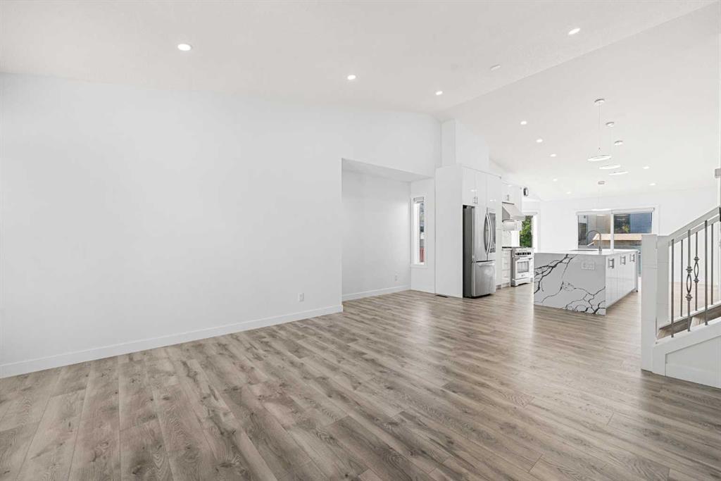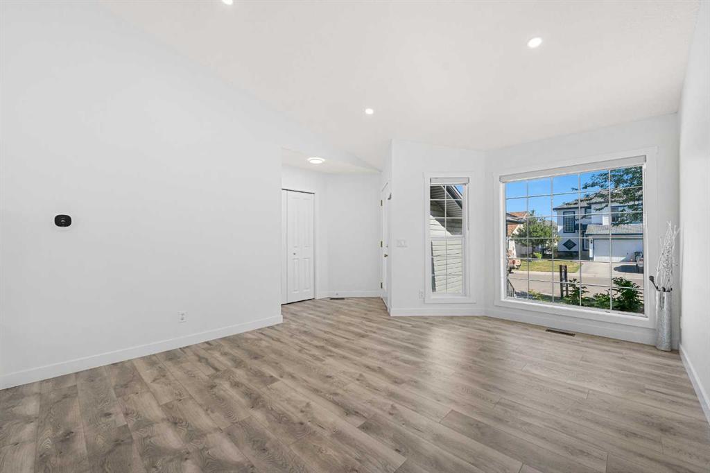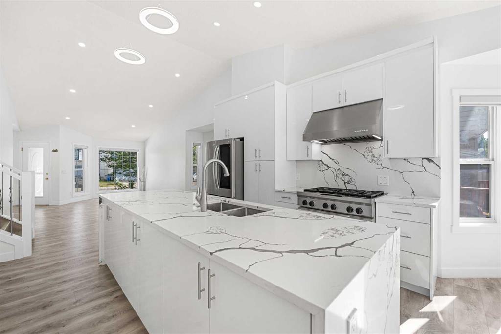 Beautiful Renovation | Move-In Ready | Incredible Location | Chef's Kitchen | Gas Stove | Quartz Countertops | Large Kitchen Island with Storage | Expansive Living Space | 4-Bedrooms | 3-Bathrooms | Vaulted Ceilings | Pot Lighting | Laminate & Carpet Flooring | Large Backyard | Deck | Concrete Patio | Double Attached Garage. Welcome to this remarkable 4-level split family home with 4 bedrooms, 3 bathrooms and an expansive living space. The front door opens to a foyer with closet storage for easy organization. The front family room bright with natural light beaming through the large windows. The open floor plan and high vaulted ceilings emphasizes the true size of this main level. The kitchen is sparkling with quartz countertops, gloss finished cabinetry, stainless steel appliances, a 6 burner gas stove and a large centre island with a marbled design and ample cupboard storage. Off the kitchen is a dining room framed with windows sliding glass doors that lead to the deck! Upstairs holds 3 bedrooms and 2 bathrooms. The primary bedroom is outfitted with a trendy linear ceiling fan and large windows allowing for ample natural light. The primary has a walk-in closet and a 4pc bathroom with a soaking jet tub, walk in shower and single vanity with extended storage. Bedrooms 2 & 3 on this upper level share the main 3pc bath with a walk-in shower. Down a few steps from the kitchen is a living room accented with a corner gas fireplace and sliding glass doors that lead out to the patio making indoor/outdoor living easy! This level has the 4th bedroom and a 3pc bathroom with a walk-in shower. The mudroom that leads to the interior garage door is also the laundry room! This is well laid out with plenty of space for bench storage