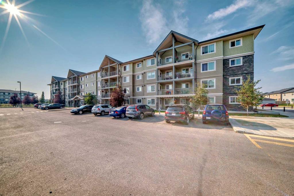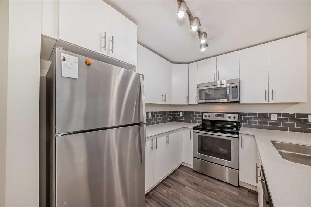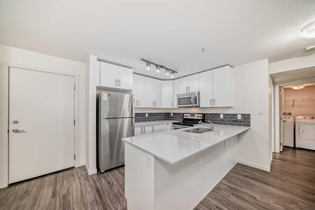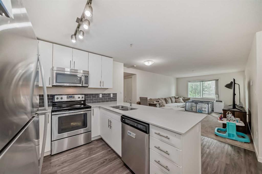 Experience incredible value in this modern 2-bedroom corner unit located on the first floor of McCall Landing. With its bright and open layout, this unit is beautifully finished with luxury vinyl plank flooring and a neutral colour palette, allowing you to easily personalize the space. The kitchen is a highlight, featuring bright white cabinetry, quartz countertops, stainless steel appliances, and a peninsula with seating. It seamlessly flows into the spacious main living room and dining area, perfect for entertaining or relaxing. Both bedrooms are generously sized, offering ample space and comfort. The unit includes a full bath, the convenience of in-suite laundry, and plenty of storage space. It has been recently painted to enhance its fresh, modern feel. McCall Landing offers numerous amenities, including a fitness center, common recreation room, dog run, community gardens, and bike storage. The unit also comes with a private patio and titled parking. You'll love living in Skyview Ranch, a community conveniently located close to Deerfoot, Stoney, and Metis Trails, as well as the Calgary International Airport. The neighbourhood features green spaces, extensive playgrounds, and groomed walking paths. There are also several schools in the area, along with shopping, restaurants, and all other amenities. Don’t miss out on this fantastic opportunity, book your showing before it's gone!