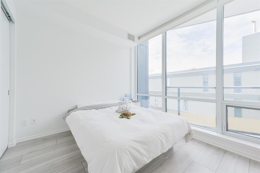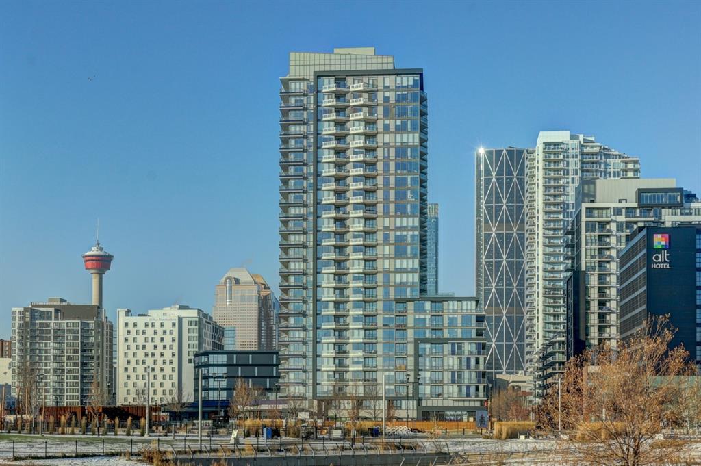 Here’s a great west-facing, super clean and bright condo on the 5th floor in East Village! It features one bedroom, one full bath, and a small den that can serve as a workspace or a spot for a desk. The kitchen is stylish with modern light cabinets, a stove top, built-in oven, dishwasher, and fridge, all blending seamlessly with the cabinets. There’s also a built-in microwave in the island. The living room is spacious with floor-to-ceiling windows looking out to a quiet inner courtyard. Imagine relaxing on the balcony in the evening! The primary bedroom is roomy. The condo includes an underground titled parking stall and extra storage in the basement. The building has amenities like a massive party room, gym on the 6th floor, a guest suite, observation lounge and public deck on the 25th floor with a fantastic view, plus 24-hour concierge and security. It's within walking distance of the new public library, river pathways, LRT, Bell Studio, Inglewood, and much more. Come view this condo unit today!