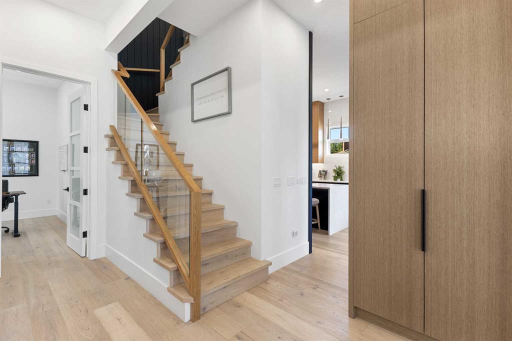 This stunning property is nestled away on one of Bridgeland’s most coveted streets and features a self contained 2-bedroom legal suite and DT Skyline Views! With over 3600 sq ft of developed space and well-appointed in high end luxurious custom finishings. As you enter the home you are greeted by the lavish 7” inch plank white oak hardwood flooring and flooded with natural light with massive windows and 11-foot ceilings. Chefs Dream Kitchen with tons of two-tone white oak and dark cabinetry, 10 ft oversized waterfall quartz island, white porcelain backsplash, and with commercial grade appliances with 6 burner gas range, paneled fridge, and built in oven, microwave, and coffee machine. Open to the spacious living room with feature floor to ceiling tile faced gas fireplace. Formal dining area with large picture window and feature black slated wall. A large office/den/bedroom and gorgeous full 4-piece bathroom complete the well laid out main floor. Head upstairs to the master suite with spa-like ensuite bathroom with “his and her” quartz undermount sinks, designer light fixtures, under cabinet lighting, wall to wall mirrors, walk-in closet, and massive walk-in double shower with dual rainfall shower heads, floor to ceiling tile and 10mm glass! An additional 3 good sized bedrooms, upper floor laundry room, and another 2 full bathrooms for all your family's needs. Expansive bonus room/family room with built-in wet bar, fireplace feature wall, and large balcony with DT views is the main hub of the home. Great for entertaining, watching the big game, or movie nights! A legal 2-bedroom basement suite with the same luxurious finishings carried throughout! Large kitchen, family room with Napoleon fireplace wall, good sized bedrooms, separate laundry, and full 4-piece bathroom. Can be accessed from the main floor or its own separate entrance. Great space for nanny, mother-in-law, teenagers or mortgage helper! Oversized double attached garage with large, paved driveway that can fit another 4 cars if needed! Home Equipped with central A/C for those hot summer days and a fully fenced low maintenance yard space with patio. All this on a quiet tree-lined, one-way street just minutes to DT core and steps to all the trendy shops, cafes, restaurants and bars Bridgeland has to offer. This home is a must see and will be sure to impress with the thought put into the details and design!