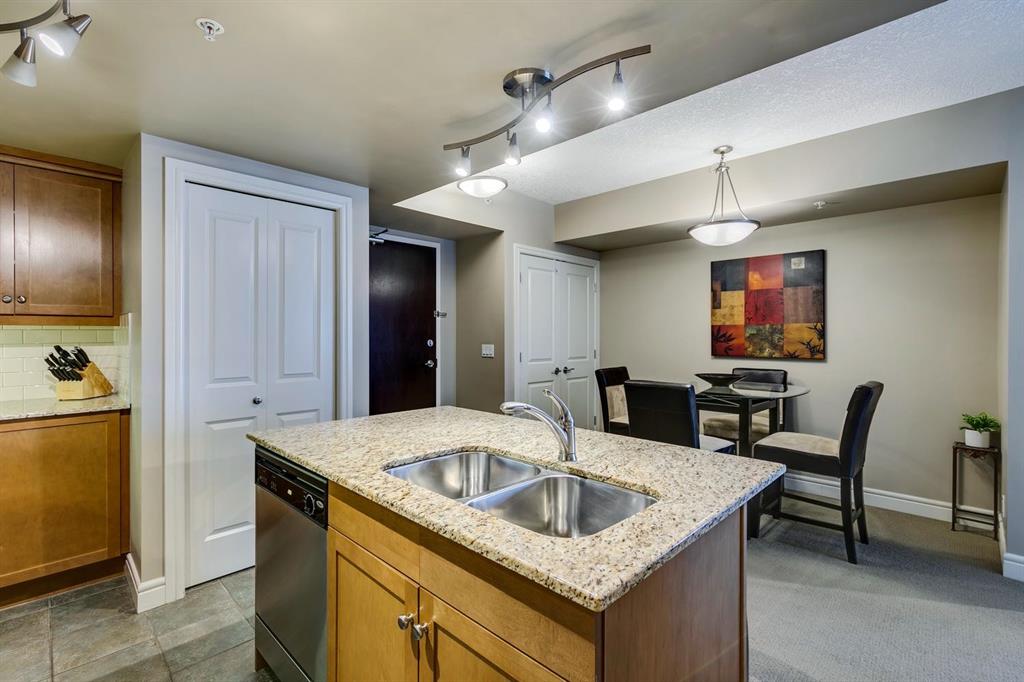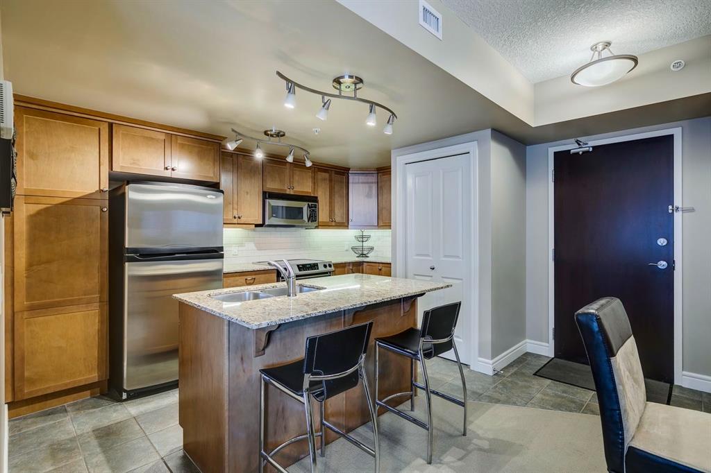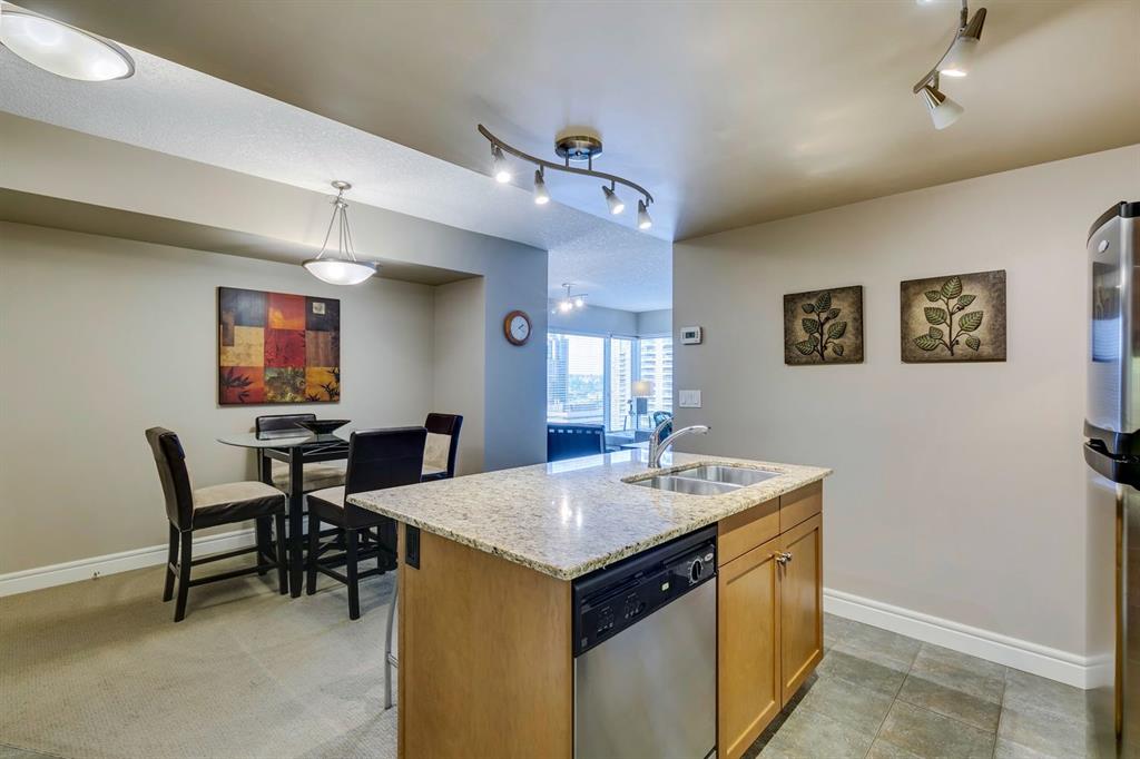 Move up in the world with this 16TH FLOOR CORNER condo!! This clean 1-bed condo is in a well-maintained concrete condo building with 7-day/week concierge, 2 elevators, heated indoor parking and in-suite laundry! Just one block away from the Bow River, you can enjoy evening strolls or bike rides exploring the beautiful park spaces that Calgary has to offer along the river pathways! Cross the bridge into Kensington and check out some of the city's best restaurants, cafes, boutique stores and stock up on groceries, all within a short walk. The c-train is two blocks away so you can easily head up to U of C or down to the Saddledome for an event! Inside this corner suite, you'll enjoy a wood kitchen with granite counters, under-cabinet lighting, stainless steel appliances and plenty of storage space. The dining area fits a full table or could be converted to a work-from-home setup. The spacious living room has wall-to-wall windows to enjoy natural sunlight all day long - but don't worry about the heat! This building has central AC :) In the winter, you can enjoy the cozy gas fireplace. Your private balcony is perfect for cooking on the grill! Primary bedroom has double closets and a cheater door to the full bathroom. BONUS - this unit is being offered fully furnished including all kitchen & household goods so you can move right in or add it to your rental portfolio as a furnished rental. Immediate possession available.