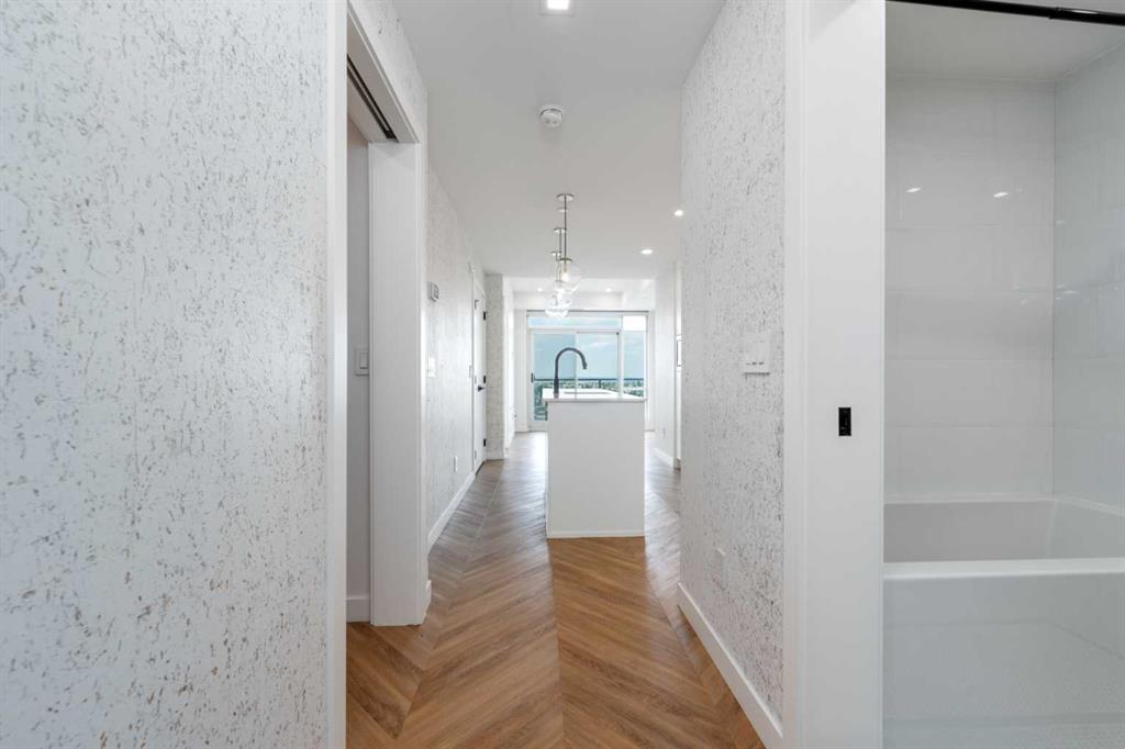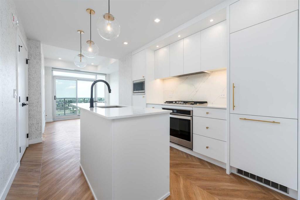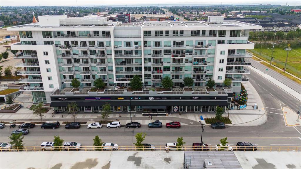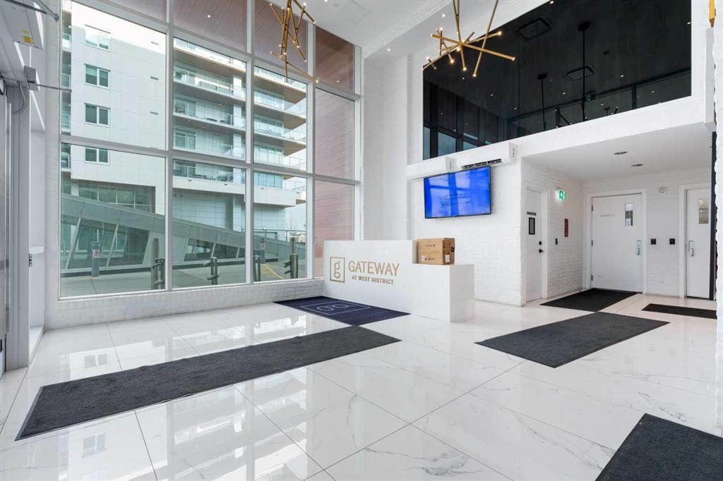 Welcome to "The Gateway". Located in the highly desirable West District, one of Calgary's most sought-after buildings,. This building is surrounded by top-tier amenities, including F45 Fitness, Deville Coffee, Blanco, UNA, Mercato West, & much more. With excellent walkability to essential services, direct access to Stony Trail, 20-minute commute to downtown, & a 50-minute drive to Canmore, this location is truly exceptional. This condo boasts a stunning design aesthetic with high-end finishes such as 9ft ceilings, floor-to-ceiling windows, & luxurious chevron wide plank flooring. The modern kitchen is equipped with brushed gold hardware, quartz countertops, & high-end stainless steel appliances, including a gas range, paneled fridge, & dishwasher. Additional features include LED square pot lights, soft-close drawers, a full-height backsplash, custom closets & cabinets, all contributing to the beauty & functionality of this exceptional home.