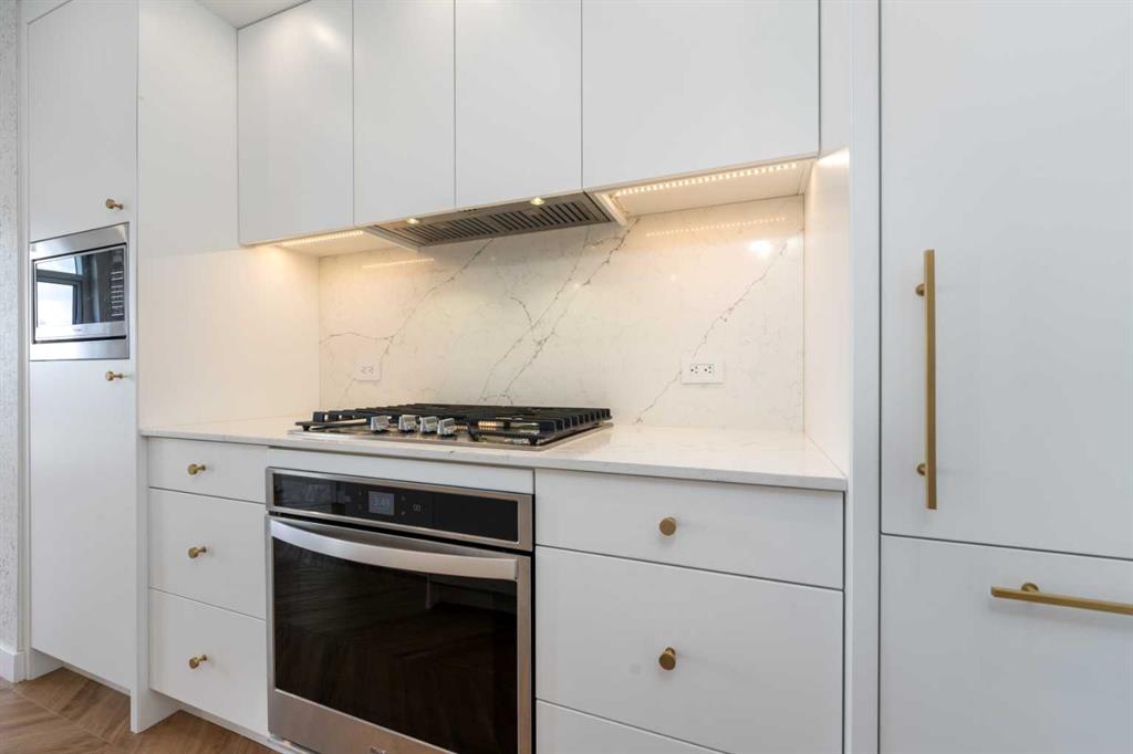 Public Remarks Welcome to "The Gateway". Located in the highly desirable West District, one of Calgary's most sought-after buildings,. This building is surrounded by top-tier amenities, including F45 Fitness, Deville Coffee, Blanco, UNA, Mercato West, & much more. With excellent walkability to essential services, direct access to Stony Trail, 20-minute commute to downtown, & a 50-minute drive to Canmore, this location is truly exceptional. This condo boasts a stunning design aesthetic with high-end finishes such as 9ft ceilings, floor-to-ceiling windows, & luxurious chevron wide plank flooring. The modern kitchen is equipped with brushed gold hardware, quartz countertops, & high-end stainless steel appliances, including a gas range, paneled fridge, & dishwasher. Additional features include LED square pot lights, soft-close drawers, a full-height backsplash, custom closets & cabinets, all contributing to the beauty & functionality of this exceptional home.
