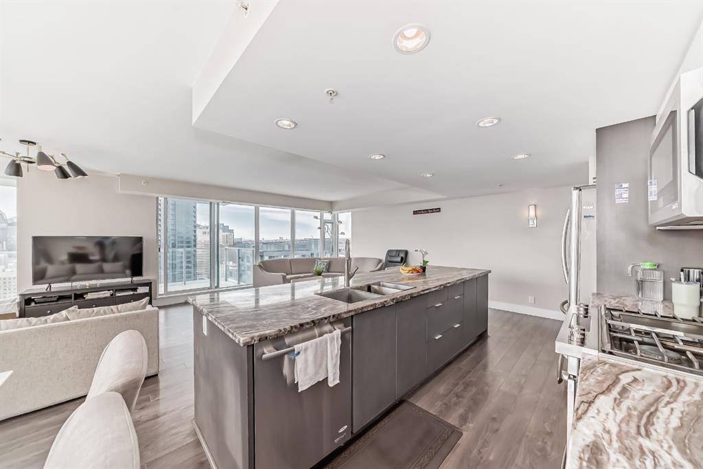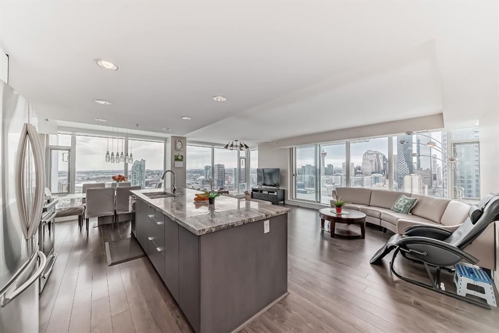 Discover downtown Calgary living at its finest in this stunning sub-penthouse located in the heart of the city. Situated on the 31st floor of the sought-after Evolution building in the East Village, this spacious 3-bedroom apartment offers unparalleled panoramic views of the city skyline, Bow River, and Rocky Mountains. With two balconies, you can enjoy breathtaking views from multiple angles. The south-facing balcony overlooks the Rockies and the iconic Stampede building, while the west-facing balcony offers views of the Calgary Tower and Bow River. Inside, a cozy nook is perfect for a home office, and the gourmet kitchen features top-of-the-line appliances, quartz countertops, and a large island. Each bedroom has its own bathroom, ensuring privacy and comfort. Additional highlights include high-end finishes, access to amenities like a fitness center and sauna, and proximity to shopping, dining, and entertainment options. Don't miss out on the chance to make this luxurious residence your own!