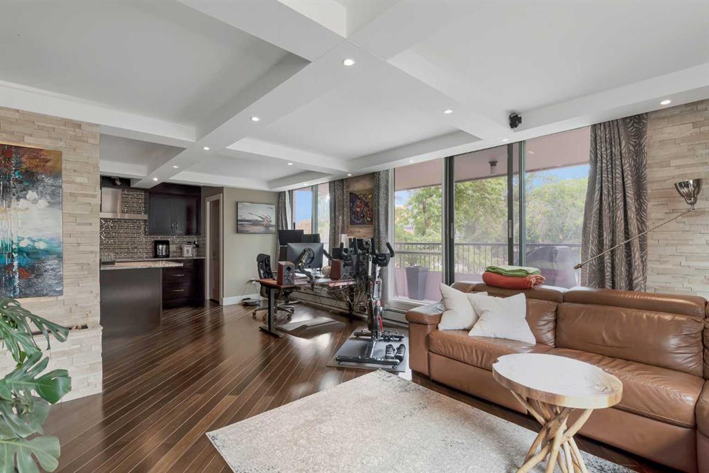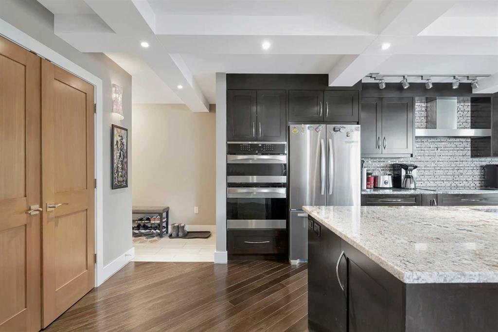 Public Remarks Discover luxury living in Hampton Court, a prestigious Mission address. This meticulously renovated corner unit boasts two bedrooms, two baths, and a sophisticated design aesthetic. A welcoming foyer leads to a gourmet kitchen featuring top-tier stainless steel appliances, rich wood cabinetry, and a walk-in pantry. The open-concept layout seamlessly integrates a dining area and a spacious living room, complete with custom built-ins, a striking tile feature wall, and a serene balcony. The primary suite is a private sanctuary with a private balcony, a generously sized walk-in closet, and a spa-like ensuite featuring a deep soaking tub. A second bedroom with built-in desk, a guest bathroom with a steam shower, and a convenient laundry/storage room complete this exceptional residence. High-end finishes abound, including hardwood floors, solid wood doors, coffered ceilings, designer fixtures, and a tranquil AC unit in the primary bedroom. Benefit from the building's recent upgrades, such as new windows, elevators, and enhanced security systems. Enjoy the convenience of heated underground parking, ample visitor parking, and a stunning party room. Check out the virtual tour or book your private showing today.