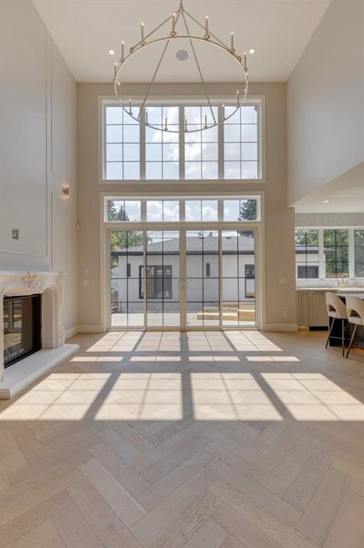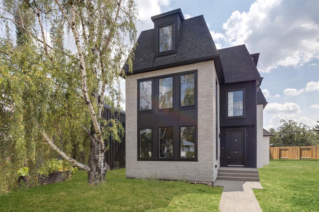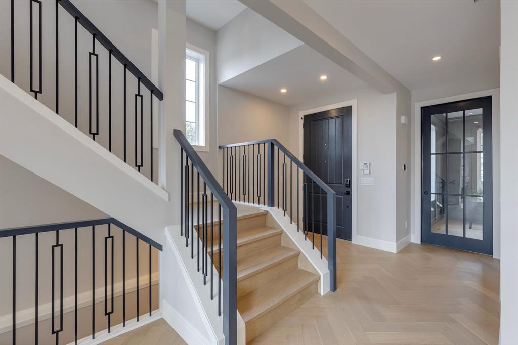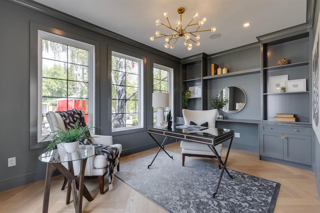 Proudly presenting this 3-storey exquisite boutique masterpiece built by Hockaday Homes. Offering over 4,680 sq ft of developed living space, this incredible home is unlike any other and has been thoughtfully designed balancing function and flow. Inside features impressive millwork, stunning white oak herringbone hardwood floors, imported tiles from Spain and Italy, in-floor heat in all bathrooms, gracefully outfitted with all hardware from Banbury Lane, light fixtures from Restoration Hardware, and stylishly designed with a modern French Provincial aesthetic. A front home office provides built-in shelving, floor to ceiling windows, and is separate from the main living quarters for an ideal work space. An elegant dining room can accommodate the largest of gatherings and features custom built-ins and a wet bar. Adorned by an abundance of southern light from the oversized floor-ceiling windows, the living room showcases soaring 19' ceilings and a show stopping ornate 48" gas fireplace with European style mantle. Effortlessly transitioning off the living room is the well equipped kitchen featuring full height custom solid wood cabinetry, 9' double waterfall Brazilian quartzite countertops, Oversized farmhouse sink with Brazil knurled bridge faucet, 1200 cfm hoodfan, and a high-end appliance package including panelled Dacor Refrigerator and JennAir 48" 6-burner gas stove with griddle. Ascend to second level where the stunning hardwood floors continue. You'll find 3 generous bedrooms (2 with ensuites), a full bathroom, convenient laundry room and a built-in homework station overlooking the main floor. The entire 3rd floor is designated to the palatial primary retreat with double doors for the utmost privacy. This tranquil retreat invites you to unwind with a spacious sitting area and gas fireplace. The lavish ensuite is like no other with a large custom glass enclosed 8'x6' steam shower with dual shower heads plus rain shower, deep soaker tub, his/her sinks with waterfall edge quartz counters, and access to the bedroom-sized walk-in closet. Escape to your fully developed lower level with in-floor heat and a vast rec room that can accommodate a media room and game space complete with light-up quartzite wet bar. Sliding glass doors invite you into a grand fitness room with ample wall plugs for equipment. A fifth bedroom and full bath is ideal for guests or teens. A soft monochromatic palette and clean lines match beautifully with the impeccable finishes and exceptional quality found throughout the home. The South exposed backyard showcases a massive deck and expands out to include the oversized triple detached garage. Prime location in Banff Trail, located within a 5 minute walk to the C-Train station, 10 minute drive to the Foothills and Children's Hospitals, Tom Baker Cancer Centre, and the UofC. This high caliber home has been designed to not just be incredibly poignant but truly functional in every aspect and will have you love coming home each day for years to come.
