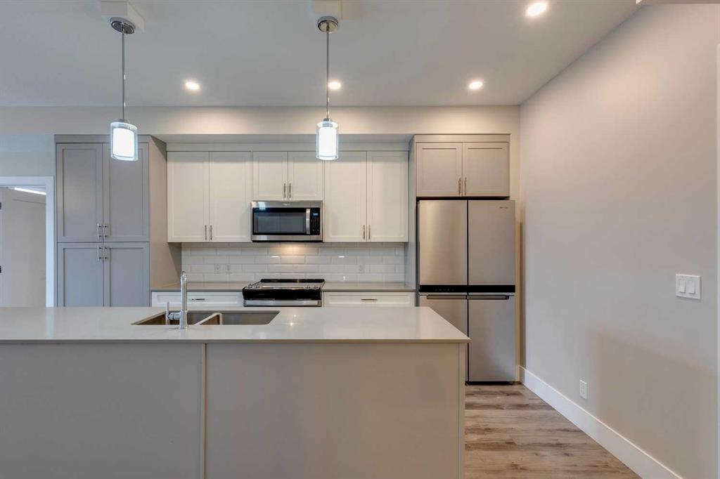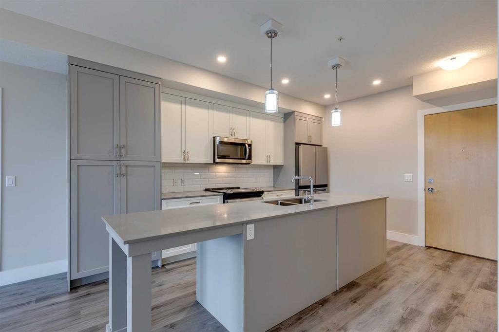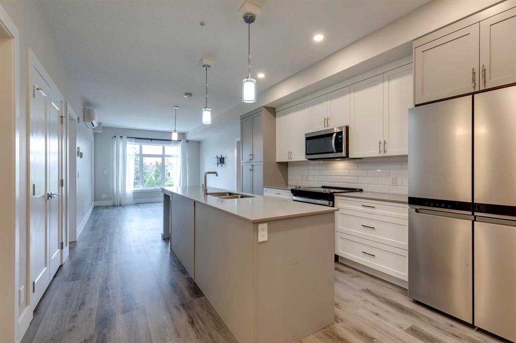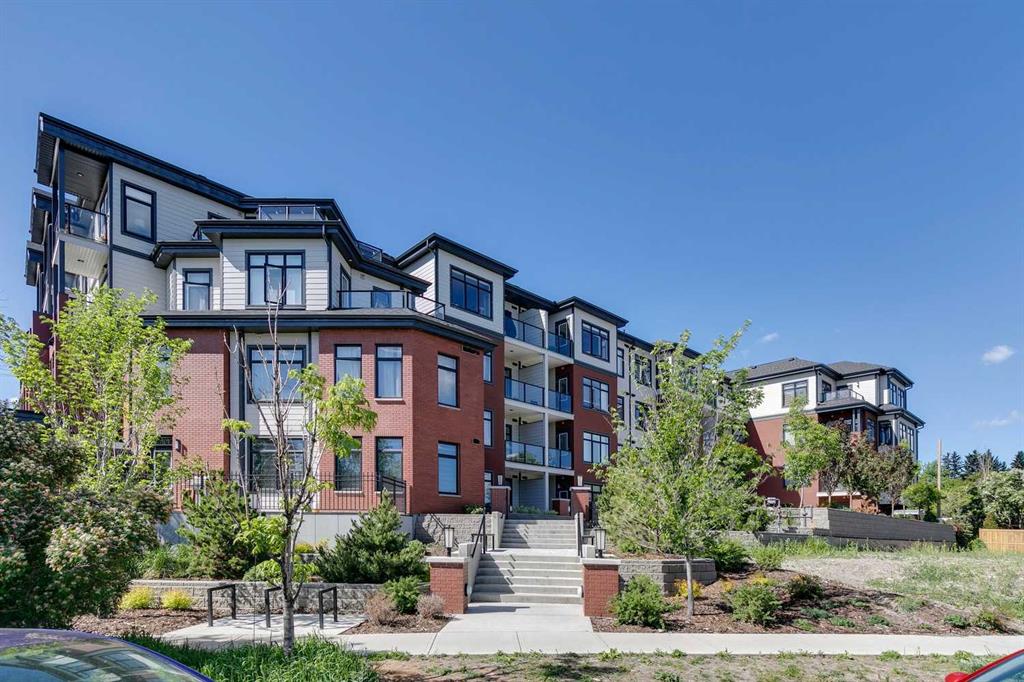 Nothing to do but move in and enjoy! Scarboro 17 was completed in 2023 and the builder spared no expenses. Beautiful exterior is finished in brick and composite siding, wonderful landscaping plus 2 elevators means no waiting to get home. Looking for a trendy, well finished condo but don't want to wait for the build to finish? This almost new, 2 bedroom, 2 bath unit w/close to 900 sq.ft will check off all the boxes. Functional floorplan with a well appointed kitchen offering an upgraded appliance package, two-toned cabinetry provides great storage, quartz counters w/plenty of prep space plus extra long island offers room for a few stools. Spacious living is complete with central air conditioner to keep you cool. Patio door leads out to the private balcony w/great downtown views. Huge primary bedroom can easily accommodate your king bed and furniture plus spacious walk-in closet provides extra storage. 4-pc ensuite is complete w/double sinks & a walk-in shower. Second bedroom is well sized with a pass through closet into the 4-pc bathroom. Tech nook is great for your desk or add a great cabinet for extra storage. Location can't be beat...walk down 17th Ave and find a great patio or coffee shop. The Calgary Tennis club is in walking distance. Sunalta LRT makes it easy to get into the core or enjoy a walk along the river. Title underground parking stall and separate storage locker is a must. Building still has Alberta New Home Warranty coverage. Pet friendly building with board approval.