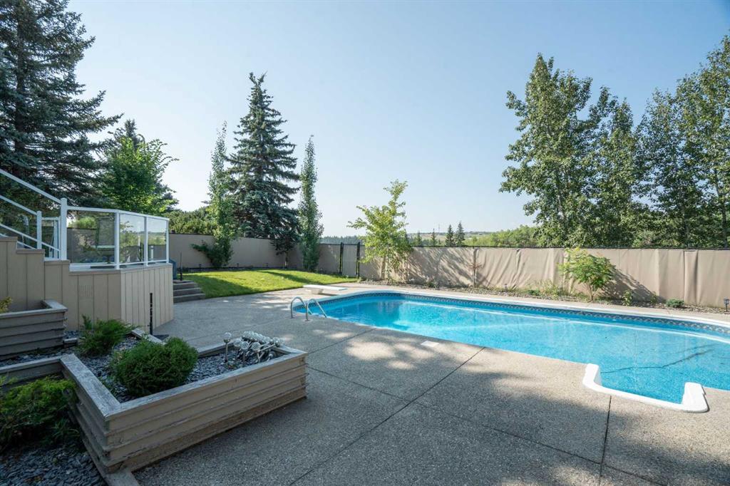 This exquisitely updated residence epitomizes luxury and comfort, reflecting meticulous renovations completed in 2024. This home boasts a plethora of high-end amenities, including a heated outdoor pool and a cutting-edge commercial-grade boiler system, among numerous other premium enhancements. Backing directly onto serene Fish Creek Park, the property offers a truly secluded sanctuary. Enjoy convenience and privacy as the pathway behind the home is also maintained by the city. With an expansive 5,675 square feet of living space, it features four bedrooms, three and a half bathrooms, a double garage equipped with 220-amp service for future needs such as an EV charger or workshop equipment, and an already-installed electric heater will keep your vehicles and toys warm year round. The fully finished walkout basement is designed for sophisticated entertaining, complete with a large bar. Approaching the residence, one is greeted by a newly installed premium cedar shake roof and three custom skylights, expertly placed by Calgary Elite Roofing. The property showcases brand new Ecoline 2X Sunshield windows, each custom-ordered, and a bespoke front door crafted for durability and enhanced curb appeal. These newly installed skylights infuse the interior with natural light, creating a warm and inviting ambiance. Internally, the home has been thoughtfully reimagined, featuring fully renovated bathrooms equipped with upscale faucets, cabinetry, and fixtures. The kitchen is a chef’s dream, offering new maple soft-close cabinets, a premium Wolf gas stove, and a suite of top-tier appliances, including a Sub-Zero refrigerator, Miele steam oven, Miele convection oven, and Miele microwave oven. Elegant 12” x 24” Phantasie Gray Marble Tile graces the floors throughout, while two newly installed Lennox air conditioners ensure year-round comfort. Custom windows with dual-layer sunshield coatings enhance energy efficiency and overall living conditions. A double-sided wood-burning fireplace with gas ignition (easily convertible from wood burning) divides the home office from the living room on the main level. This level also includes a living room, office, grand ceilings, kitchen, half bath, laundry, garage entrance, and dining area. The upper level houses three bedrooms and two full bathrooms. The walkout basement, completed with waterproof vinyl composite flooring, features an additional workspace, expansive bar, bedroom, full bathroom, boiler room, storage, and ample space for a gym and entertainment area. Outside, the property boasts newly tiled front steps, a fresh deck extending from the master bedroom and kitchen, and beautifully renovated front and backyard spaces. With its backdrop onto Fish Creek Park, this home offers an unparalleled living experience in a tranquil and picturesque setting. Schedule your private viewing today to fully appreciate this exceptional property.