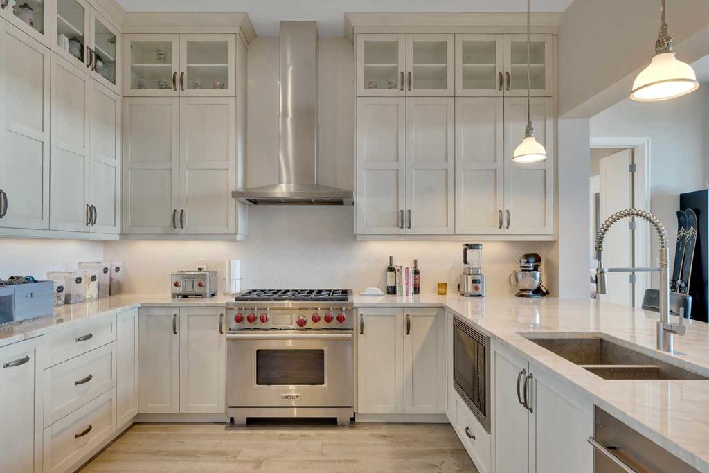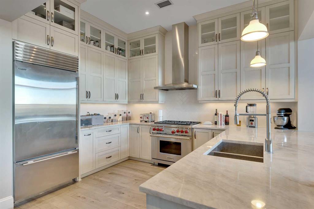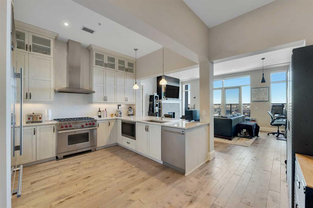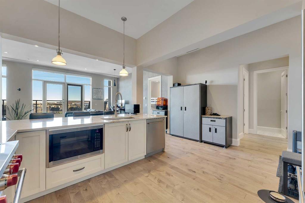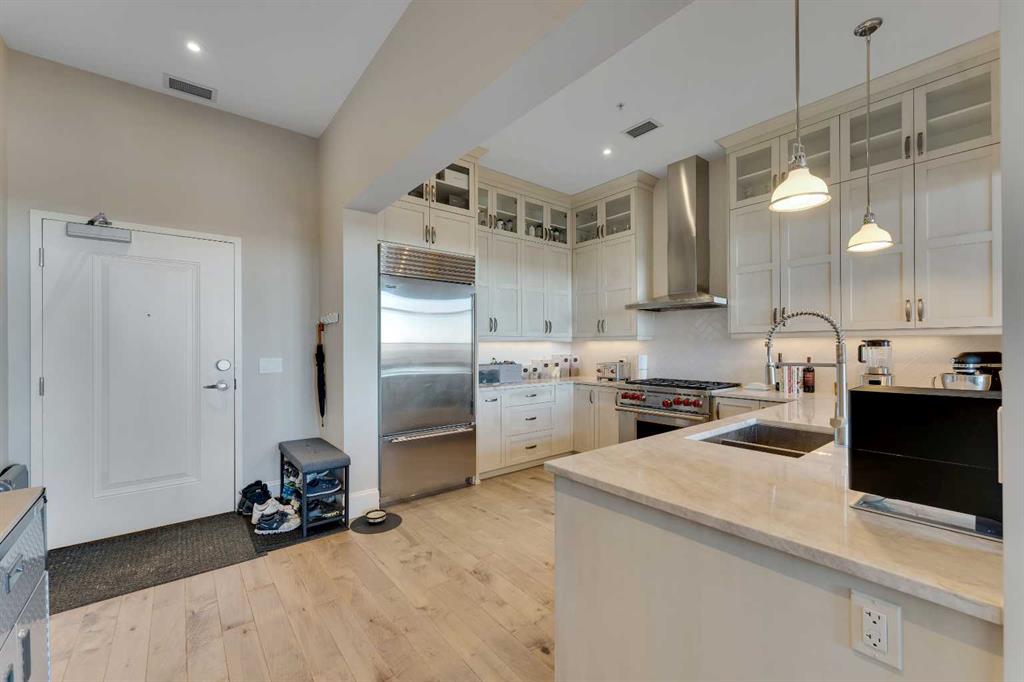 Ultra-rare penthouse in the sought-after Champagne at Quarry Park, a luxury condo complex backing onto the Bow River. This top-floor, east-facing unit offers stunning sunrise views, 10-foot ceilings, and a peaceful lifestyle in a concrete building. The 2-bedroom, 2-bathroom layout ensures privacy, with bedrooms on opposite sides of the spacious living area. The chef-inspired kitchen features custom stained cabinets, Wolf and Sub-Zero appliances, and a large granite island perfect for entertaining. The living area, with a gas fireplace, offers flexibility for various layouts, complemented by hand-scraped hardwood floors and heated tile in the bathrooms. The master suite boasts an expansive walk-in closet, a spa-like ensuite with a soaker tub, oversized shower, and motorized blackout shades. The second bedroom includes a patio door and access to a Jack-and-Jill bathroom with high-end finishes. Additional features include dual HVAC systems, smart home controls, in-suite laundry, built-in shelving, and fiber internet. The unit comes with 2 titled underground parking spaces, a large storage locker, and 24/7 access to a private car wash and secured bike storage. Champagne at Quarry Park offers direct access to the Bow River pathway, nearby parks, and is minutes from local amenities. Experience maintenance-free, luxury riverside living. Book your showing today!