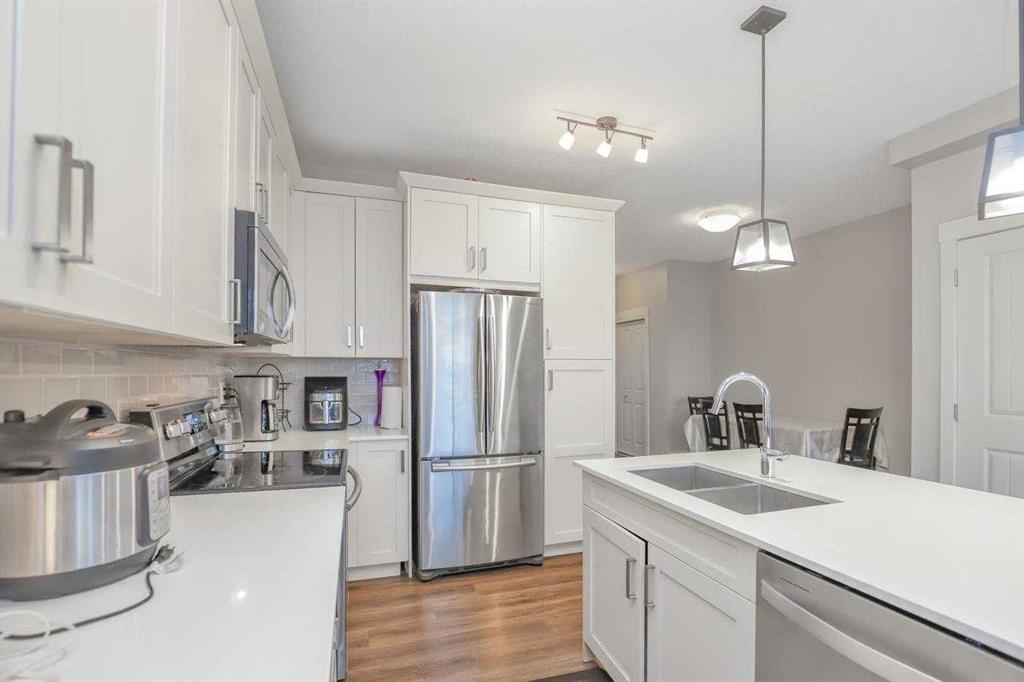 “One of the best built, multi-family townhouses in Nolanhill, built by "Cardel" with a great floorplan for 3 bedrooms and 2.5 baths. As you step inside, you’ll be greeted by the bright and airy atmosphere, with 9ft knock-down ceilings, luxury vinyl plank flooring, and recessed pot lighting that illuminates the space. The kitchen is a true highlight, featuring beautiful quartz countertops, stainless steel appliances, and a subway tile backsplash that adds a modern and sleek touch. A generous pantry completes the kitchen; it’s a chef's dream come true! Next to the kitchen, there is a charming balcony where you can bring the outdoors in! The open floor plan seamlessly connects the bright kitchen to the lovely dining area, making it perfect for entertaining guests. The living room is flooded with natural light, creating a warm and inviting ambiance. Thoughtfully tucked away from the main living area is a powder room that completes this level. Heading upstairs, there are three generous bedrooms. The primary bedroom is a sanctuary of comfort and style, complete with an ensuite bathroom, a generous-sized walk-in closet. A spacious garage attached to your home, along with a front driveway for extra parking. Location is key, and this home is close to a variety of amenities such as Costco, Walmart, Sobeys, and Shoppers Drug Mart - the list goes on! You'll have everything you need just moments away.