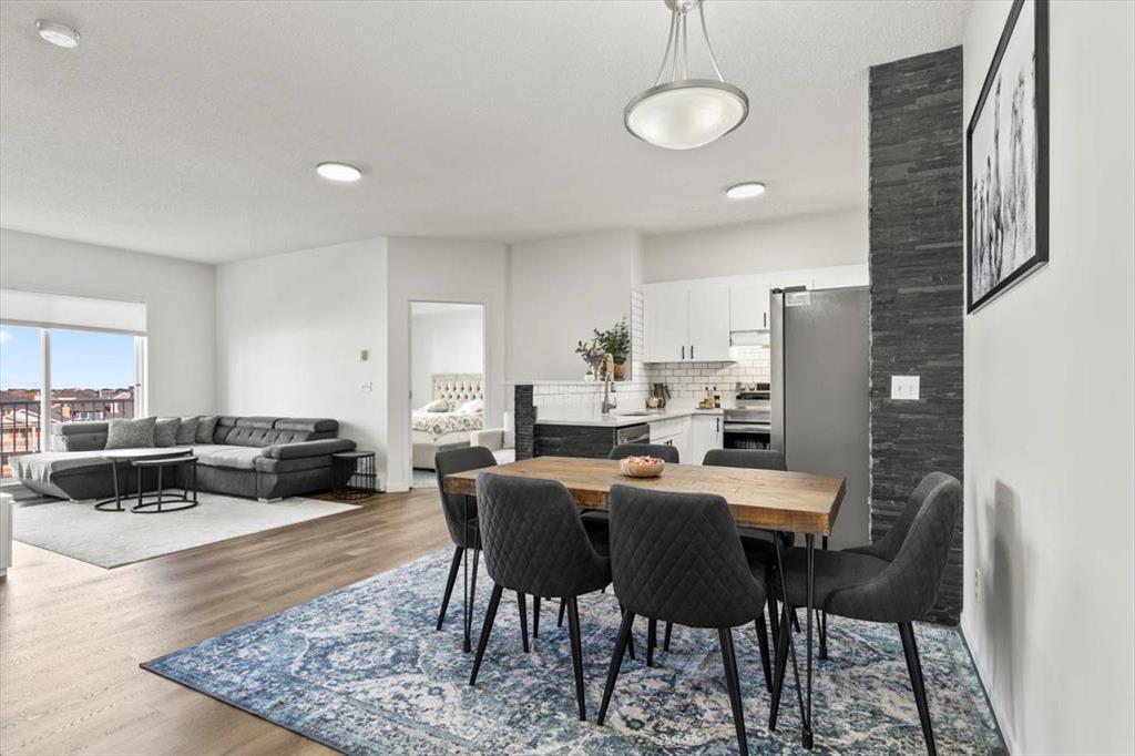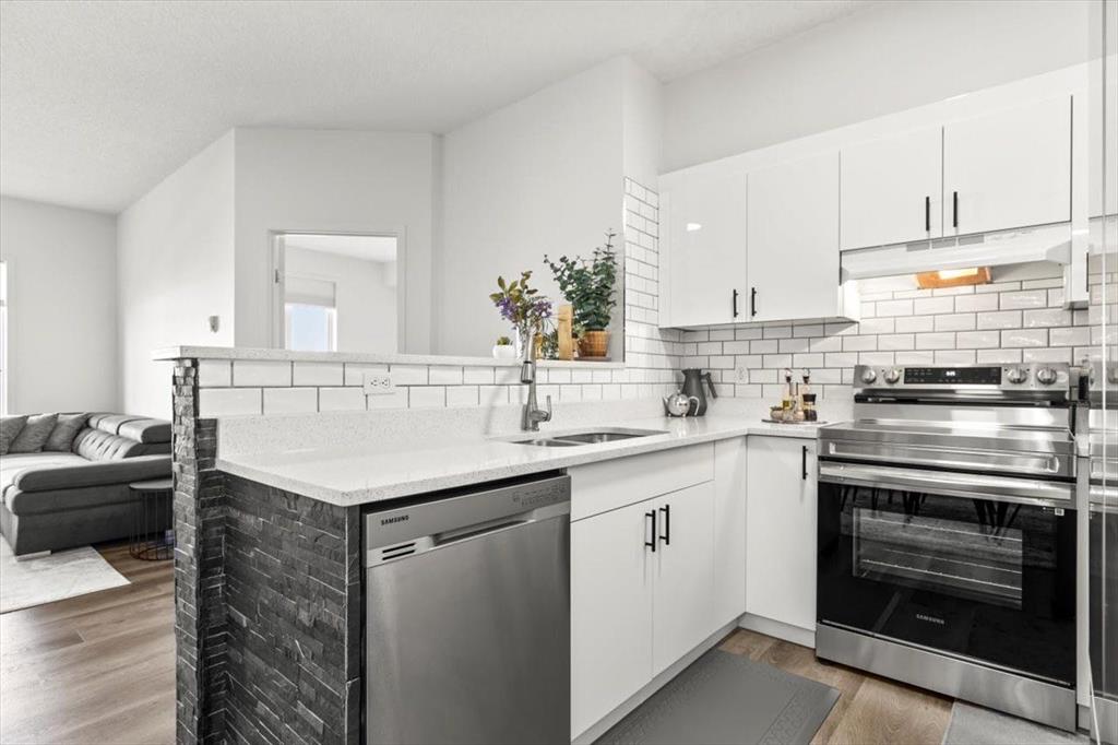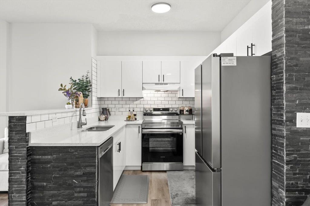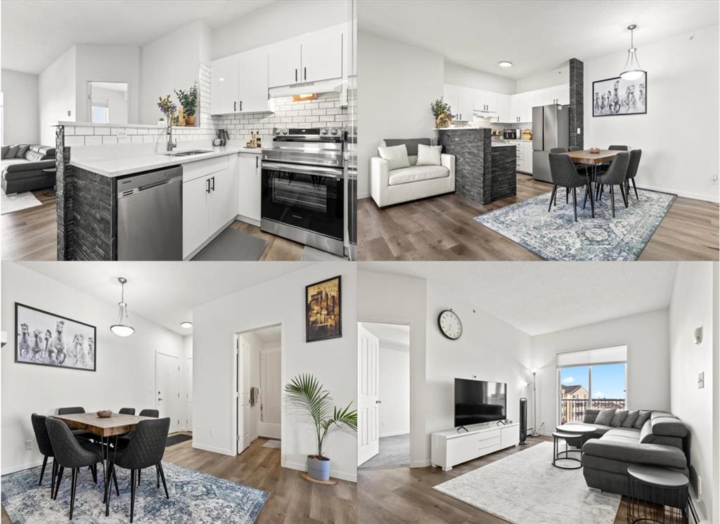 Welcome to professionally renovated top unit condo over 870 SQFT with luxury vinyl plank flooring, bright windows, new kitchen, high graded carpet in the bedrooms and an open modern floor plan. Enjoy the modern shiny glass kitchen with stainless steel appliances, glassy subway tile backsplash, quartz countertop and customized stone wok. This unit features two spacious bedrooms, the master bedroom features a 4pc ensuite and walk-in closet. Additional features include another full bathroom, convenient in-suite laundry, storage, and an assigned parking stall. The open floor plan showcases a spacious living room with large windows that flood the space with natural light. This beautifully designed unit also features a high ceiling, a private balcony, perfect for outdoor relaxation. The community hub offers a wide range of amenities, including local convenient ethnic shopping, parks, school, and LRT. Nearby services include Superstore, Costco, and Cross-Iron Mills Mall and airport.