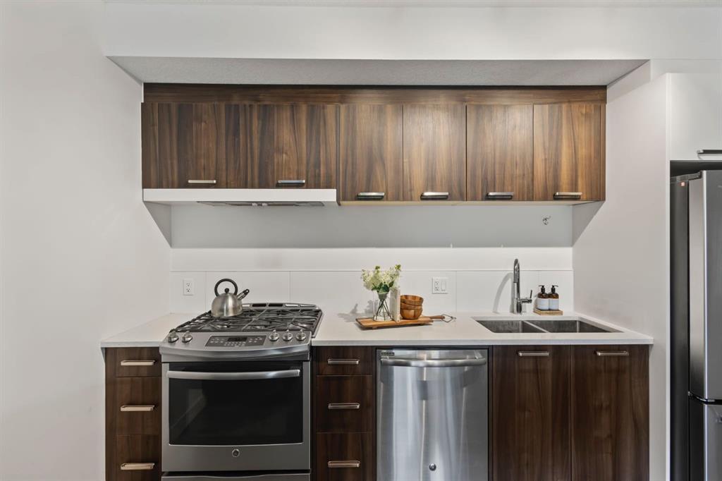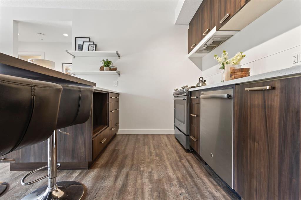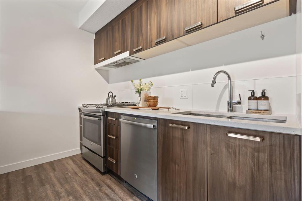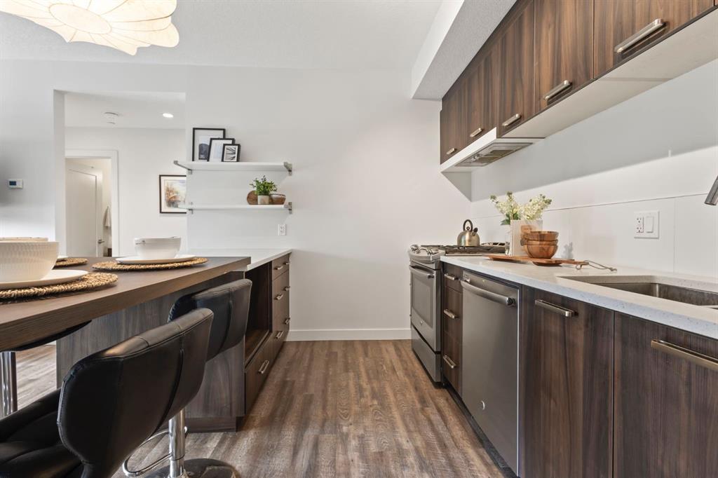 Offering a perfect blend of inner city living with a suburban feel, this 2 bedroom, 792 sqft, corner unit in Renfrew is a must see! The main living space is bright and open offering a perfect layout to host and entertain family and friends. The kitchen showcases stainless steel appliances, a gas stove and quartz countertops. The island provides loads of extra counter space, ideal for cooking, and the extension is the perfect dining area with seating for up to 5. The kitchen overlooks the living area with access to the WEST facing balcony with BBQ gas line and partial views of the downtown. The balcony feels very private and offers a great spot to enjoy the summer at home. Across the living area you'll find a short hallway leading you to the bedrooms. The primary offers a walk-in closet, large corner windows flooding the room with an abundance of natural light and a 3-piece ensuite bath featuring a stand-up shower with a sliding glass door. On the opposite side of the hallway you'll find a second bedroom with a large window. This extra bedroom would be perfect as a home office, for a roommate, or for visits from out of town guests. This unit also comes with a second full bathroom with a tub and shower combo and both bathrooms feature the same quality finishes you'll find throughout. You'll also enjoy the convenience of in-unit laundry, smartly tucked away in the main entrance closet with additional shelving for extra storage. Lastly, to check off even more boxes this unit comes with a secure TITLED underground parking stall and an additional assigned storage locker which makes all the difference when it comes to condo living. Wonderful location within seconds to Bridgeland Park, walking paths and a 5 min walk to the restaurants and services of Edmonton Trail (Dinner Deluxe, Hair Salon, Dental, Medical centre, convenience store and much more). Less than a 5 min drive to all the amazing restaurants Bridgeland has to offer, 10 min drive to the downtown core and easy access to major roads like Edmonton Trail, Deerfoot Trail and Memorial Drive.