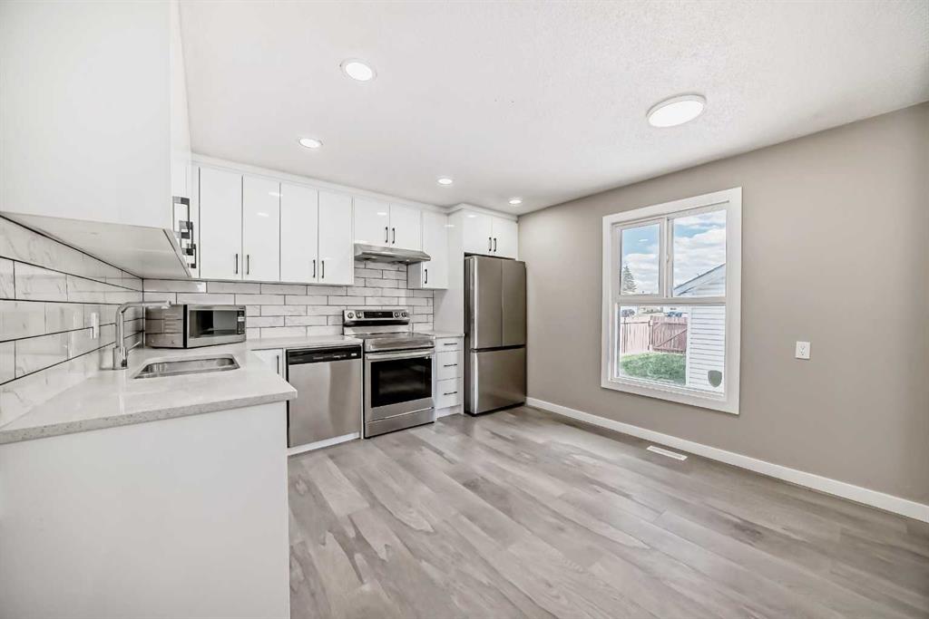 Public Remarks INVESTMENT PROPERTY: This corner lot offers a spacious and versatile layout with options to live upstairs and rent downstairs or rent both units. Located in the sought-after community of Whitehorn, this is yet another beautifully renovated designer home in a fantastic location. Upon entry, you'll be welcomed by a bright and open living room. The high-end kitchen features stainless steel appliances, stackable laundry, and a half bath. In the back you will find a large backyard and a double detached garage. Vinyl flooring is throughout the main level. Elegant railings guide you to the upper floor, which includes three bedrooms: a master and two additional generously sized rooms, along with a full 4-piece bathroom and high-quality carpeting throughout. The fully finished basement, accessible via a side entrance, includes a family room, kitchenette, Furness room, with separate laundry, a full 4-piece ensuite bathroom, a bedroom. The fenced backyard provides ample space for various activities. Conveniently close to all amenities. Thank you for viewing, and enjoy!