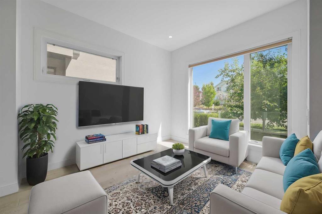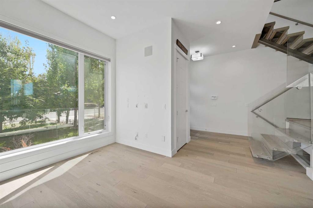 An inner city lifestyle infill like no other! Step away from cookie-cutter with this intelligently designed and completely original take on modern open concept living in Calgary. Panoramic mountain views! This unique layout allows for the square footage of a 3 storey home but in a less stair-heavy design. Built well above the standard building code and loaded with premium built-ins, extras, & features. Soaring 14’ & 10' ceilings with wide plank white oak hardwood floors. Exciting sunken living room design element & focal point steel beam open riser staircases clad in 10 mm glass panels. Entertainer’s dream kitchen with deluxe stainless steel appliances, quartz waterfall edge island & perimeter countertops, high gloss cabinetry, & built-in coffee maker. Upper level private master retreat with stunning vaulted ceiling & overhead skylight. Adjacent den/home office flex space. Incredible walk-in closet with built-ins. Spa inspired 5pc ensuite including separate deep soaker tub, 10 mil glass shower, in-floor heating, & dual vanity. Very unique separate split level off the main floor which is home to 3 more bedrooms & 2 full bathrooms including 1 ensuite. Lower basement level with huge media room with full length built-in & full bar with wine/beverage cooler. Many upgrades & extras including in-floor heating in bathrooms, 2 central A/C units, over-spec party wall construction, 18 foot tall concrete foundation wall, flat painted ceilings throughout, & multiple outdoor living spaces including large rear deck off the kitchen with sunny west exposure. Offering both city and mountain views! Full walkout lower level with separate entrance has the potential to be an easy separate rental unit conversion. Oversized double detached garage. The total package inner city lifestyle home for those looking for something unique!