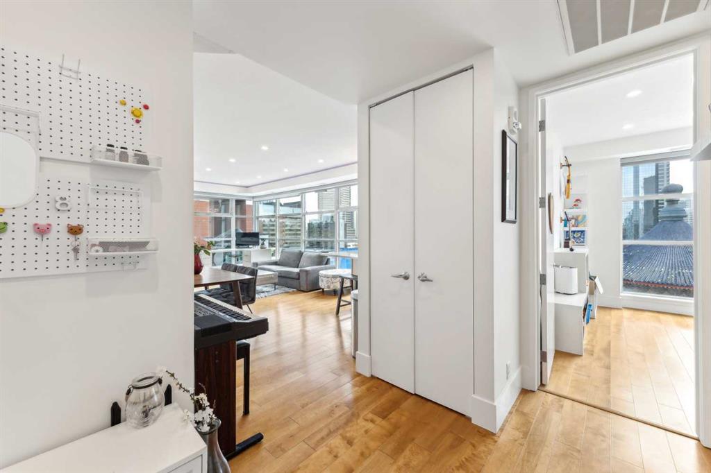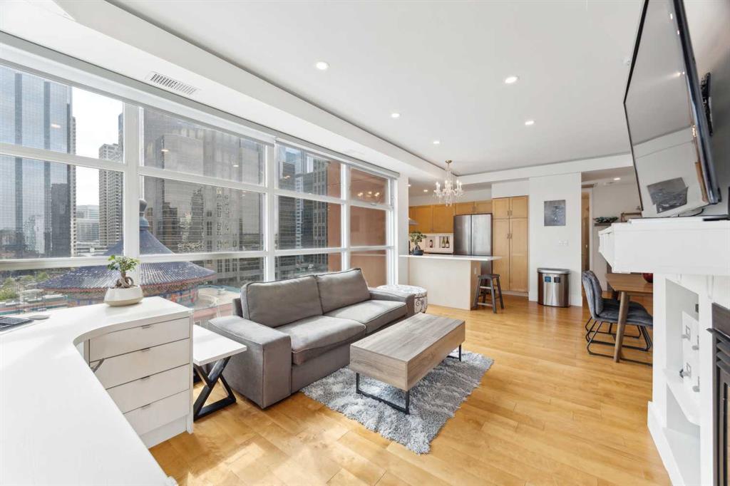 This spacious corner unit boasts floor-to-ceiling windows that offer stunning views of the Bow River and the downtown skyline. The open, thoughtfully designed layout includes 9-foot ceilings and elegant hardwood floors. The central kitchen features a convenient eating bar and modern stainless steel appliances. There have been many upgrades over the past year, solar-powered smart blinds, knockdown ceilings, pot lights throughout, a new kitchen backsplash with built-in niches, and quartz countertops. The living room is warm and inviting, with a cozy gas fireplace, built-in shelving, and a patio door that opens to a large, private balcony. The primary bedroom includes a walk-in closet and an ensuite bath, while the generously sized second bedroom is situated on the opposite side of the unit for added privacy and has easy access to the second bathroom. Additional highlights include air conditioning, heated underground parking for one vehicle, and in-suite laundry with extra storage. This prime location is just steps away from the river, Eau Claire, and the city center, with restaurants, bars, entertainment venues, theatres, museums, the Bow River, Chinatown, East Village, transit/LRT, and churches all within walking distance.