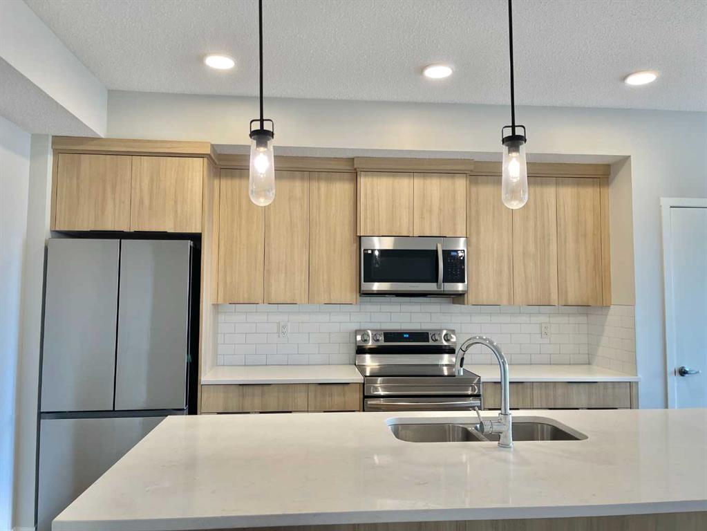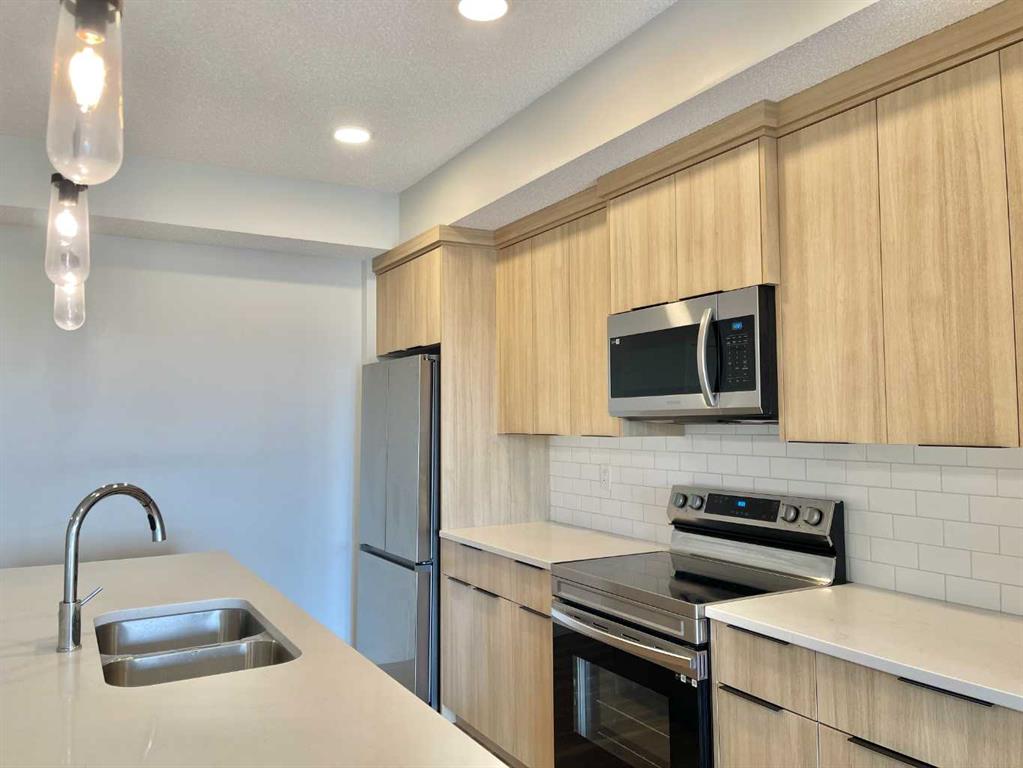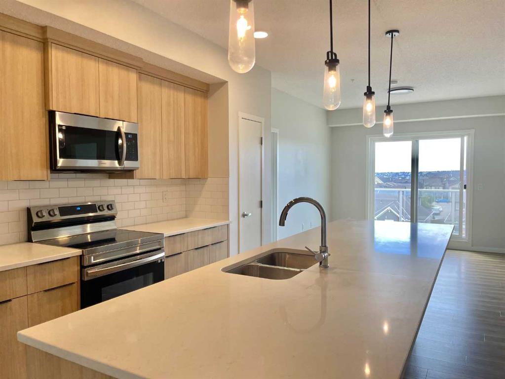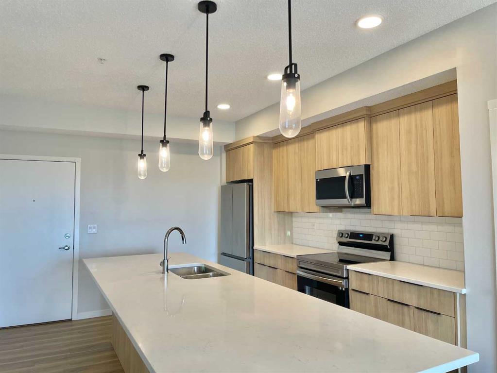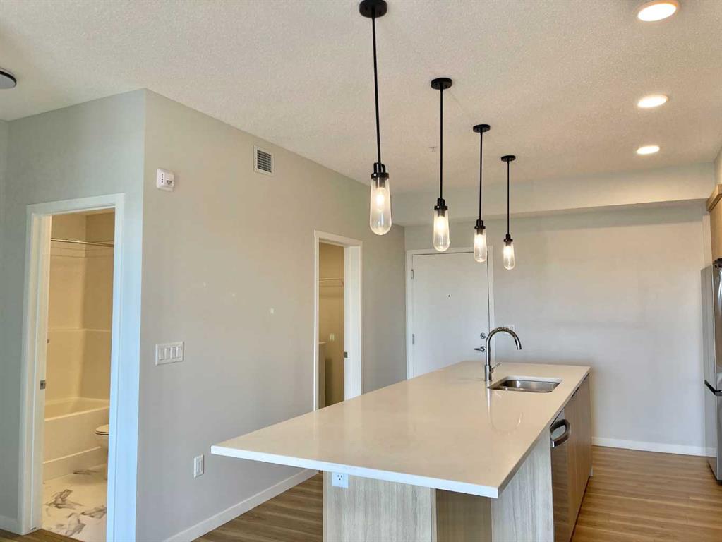 Newly built in 2022, this two-bedroom, two full-bath south-facing condo is located on the top floor of the building with heated underground parking. The thoughtful layout places two bedrooms and two bathrooms on opposite sides of the living room, offering privacy. Both bedrooms have windows, and the living room opens to a door for easy outdoor access. This condo boasts an efficient design, with every space optimized for functionality. Enjoy luxury vinyl plank flooring, quartz countertops, and various upgrades. The master bedroom includes a walk-in closet and a 4-piece ensuite bathroom, while the second bedroom also has a walk-in closet and its own 4-piece bathroom. The unit features 9-foot ceilings, plus spacious balcony and one titled underground parking space. The condo is close to a beautiful park, perfect for relaxing walks, and within walking distance to a plaza with restaurants, McDonald’s, Shell gas station, gym, pharmacy, doctor’s office, No Frills, and more. With quick access to Stoney Trail and just 15 minutes from Calgary airport, this condo is available for quick possession. Don’t miss out on this gem—book a showing today and discover why Carrington Plaza is a great place to call home.
