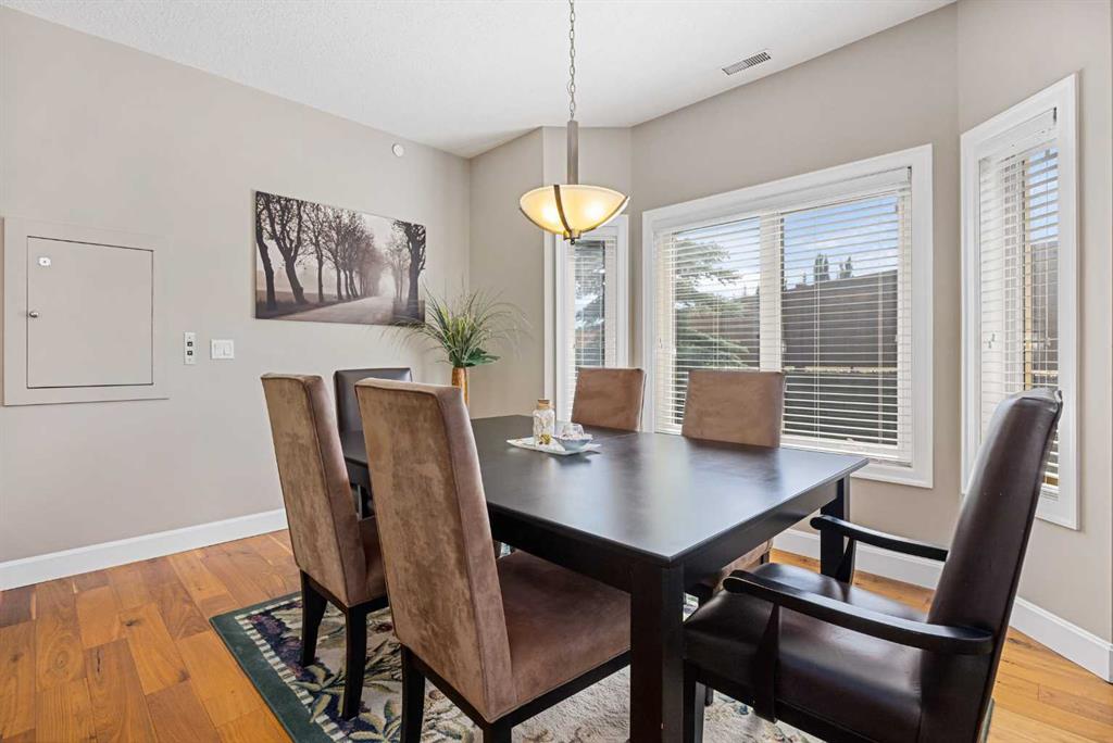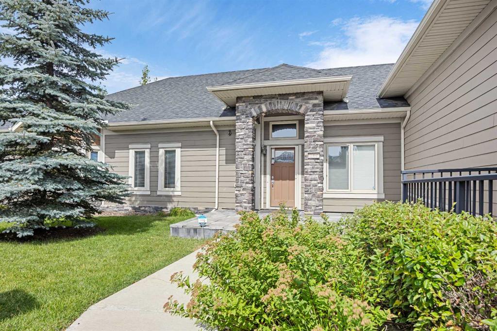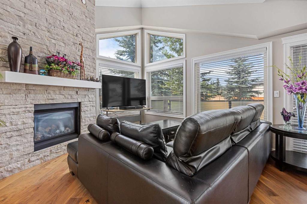 Beautiful executive bungalow in a charming lock-and-leave villa-style complex. This former showhome is loaded with upgrades! Over 2,080 sq. ft. of developed space includes 3 bedrooms + a den (all on the main level!). Never worry about parking thanks to 3 stalls, 1 of which is tandem granting room for 4 vehicles! Inside this gorgeous sanctuary are soaring ceilings, gleaming engineered hardwood floors and extra corner windows for abundant natural light. Geothermal heating and cooling ensure your comfort in any season. Grand vaulted ceilings and a floor-to-ceiling stone-encased fireplace in the living room come together to create a relaxing atmosphere. Culinary adventures are inspired in the dream kitchen featuring quartz countertops, a plethora of full-height cabinets, a gas cooktop, stainless steel appliances, soft-close hinges, a unique dumbwaiter and a massive island with a raised breakfast bar to casually gather. Host large or intimate events in the adjacent dining room nestled amongst windows. The expansive west-facing back deck encourages a seamless indoor/outdoor lifestyle for weekends spent lounging or summer barbeques with friends. An enclosed den provides a tucked away work or study space. All 3 bedrooms are on this level including the primary oasis – a true owner’s retreat with corner windows, a large walk-in closet and a private ensuite that will leave you feeling spoiled daily. Dual vanities, a deep soaker tub, a separate oversized shower and tons of incorporated storage add to the allure of this incredible space. A large rec room in the finished basement is the perfect flex space for a media room, a home gym or hobby area. Further adding to your comfort and convenience are in-suite laundry, a private storage room in the garage and visitor parking throughout the complex. Phenomenally located within walking distance to schools, transit and several parks. Just a quick drive to West 85 shops, West Side Rec Centre, a multitude of Aspen Woods amenities and Winsport plus easy access in and out of the community via Stoney Trail and just an 8-minute drive to the LRT station. Truly an unbeatable location for this gorgeous, move-in ready home!