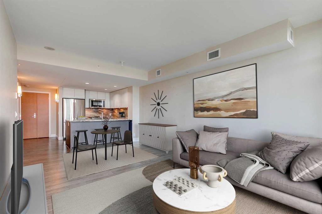 Discover downtown Calgary living at its finest on the 17th floor in the prestigious Evolution - Pulse building, nestled in the heart of Calgary's vibrant East Village! This elegant 1 bedroom, 1 bathroom residence boasts floor to ceiling windows that offer breathtaking south views of the Saddledome, Calgary Tower, and the Bow River. The open concept layout and soaring ceilings create a spacious, airy feel, while an abundance of natural light floods the space. The modern kitchen features stainless steel appliances, gas stove, undermount lighting, and luxurious granite countertops, complemented by stylish vinyl plank flooring throughout. The spacious living room flows seamlessly into a private balcony, where you can unwind and soak in the vibrant cityscape. The primary bedroom is a relaxing oasis - wake up each morning with breathtaking views from your expansive floor to ceiling windows. The 4-piece bathroom features granite countertops, a deep soaker tub, and in-floor heating. Other highlights include central A/C, in-suite laundry, dual zone heating/cooling in both the bedroom and main living space, underground parking, and a separate storage locker. Residents will enjoy premium amenities including concierge services, a state of the art gym, relaxing sauna and steam room, huge rooftop terrace, and owner's lounge. Located just minutes from Stampede Park, Studio Bell, scenic paths along the river, public transit, and a variety of trendy shops and restaurants, this home offers convenience and a dynamic urban lifestyle.