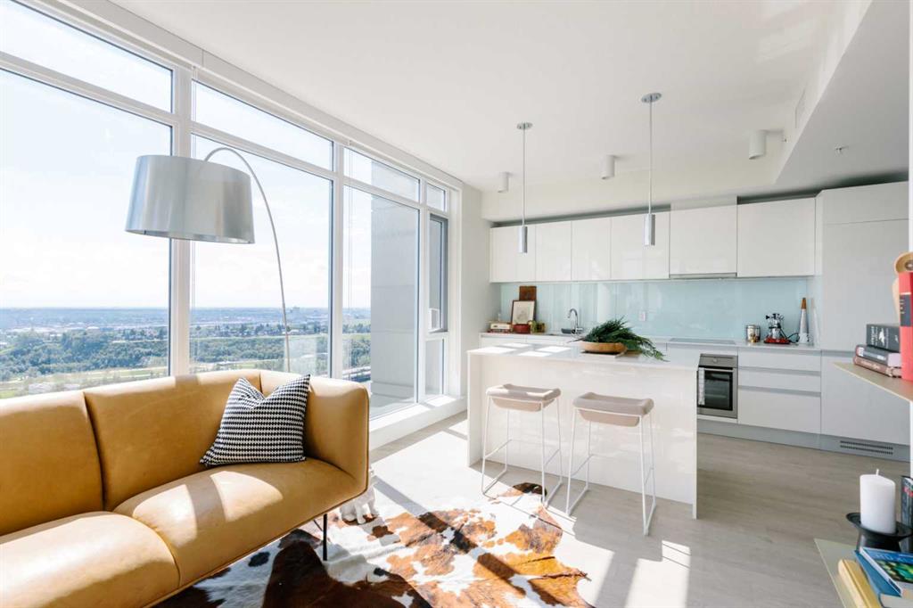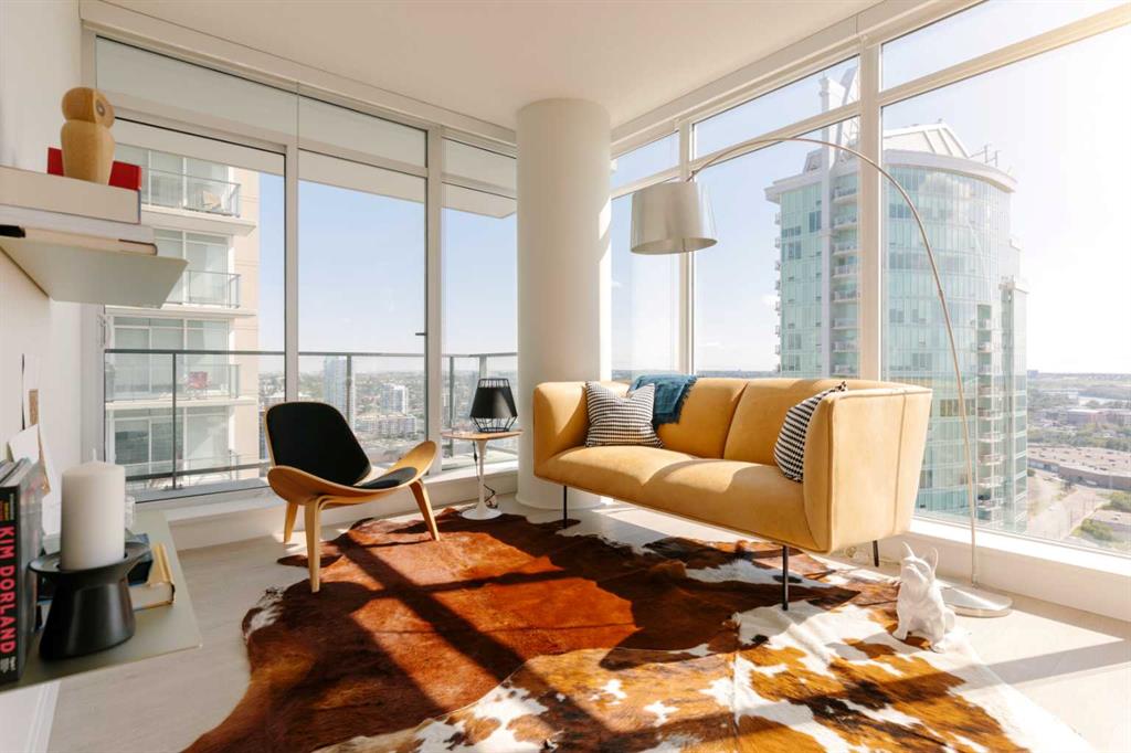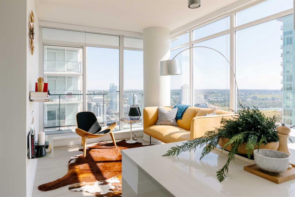 Beautiful CORNER unit at the Guardian - Calgary’s tallest residential building, with panoramic city and river views. This incredible 2-bedroom, 2-bath unit is situated on the 30th floor and includes a TITLED PARKING stall and assigned storage locker. This unit is in PRISTINE CONDITION and move-in ready. This home has an open functional floor plan, wrap-around corner views to the north and the east, and TWO SPACIOUS BALCONIES. The kitchen is equipped with built-in German appliances, and a sleek modern kitchen perfect for cooking and entertaining. Floor to ceiling windows span the entire width of the suite, offering a bright airy space during the day and the ambiance of city lights at night. The primary suite is located away from the 2nd bedroom and has a walk-in closet and 4pc ensuite. The building also includes extensive amenities such as a state-of-the-art gym, workshop, social room with garden terrace, 24-hour security & concierge. Conveniently located in the Beltline community of downtown Calgary within close proximity to Downtown, the Stampede grounds, Central Public Library, River walk and parks, Sunterra Market, and the LRT. Enjoy the convenience and excitement of downtown living, while taking advantage of the ultimate opportunity to get invested into a rising neighborhood. Additional parking stall available for purchase