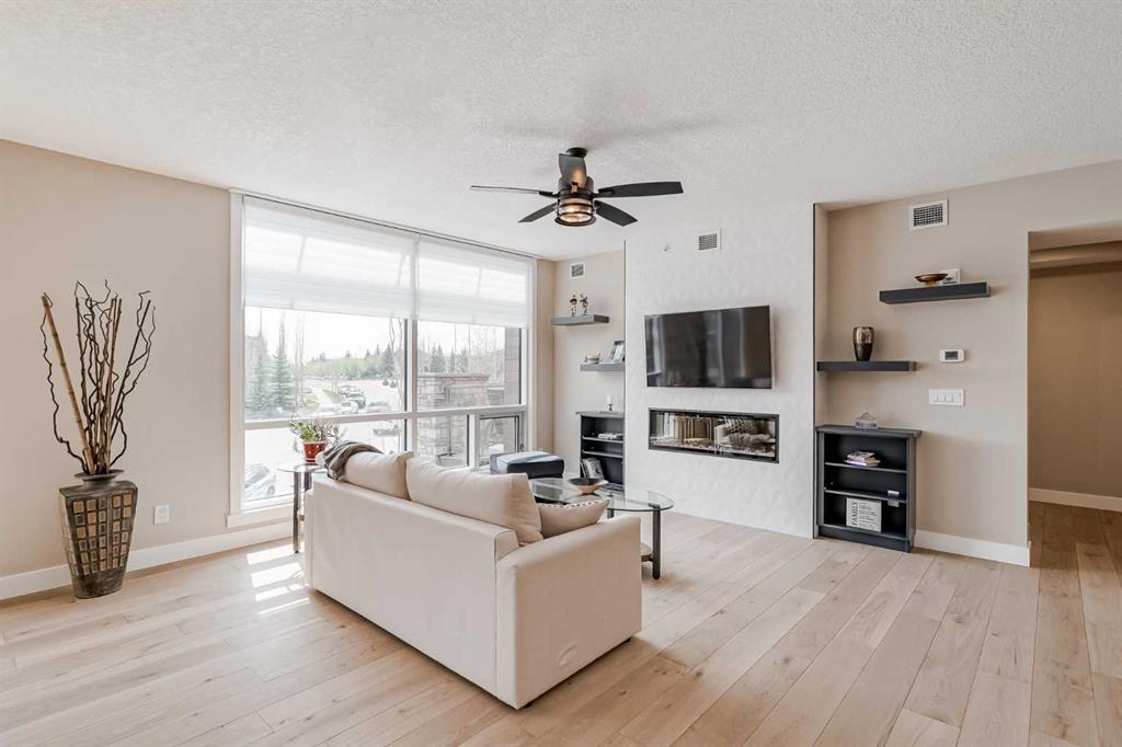 Public Remarks Welcome to luxury living at The Views, where this top-floor 3-bedroom unit offers a blend of modern elegance and timeless design. Constructed with concrete and steel, this state-of-the-art building stands as a testament to enduring quality. Step inside and immerse yourself in the inviting ambiance illuminated by floor-to-ceiling windows that bathe the space in natural light. The open-concept layout seamlessly integrates the living, dining, and kitchen areas, fostering an ideal environment for entertaining. The kitchen, a haven for culinary enthusiasts, boasts a spacious island, ample quartz countertops, and top-of-the-line Wolf appliances, including an induction stove top with the option to switch to gas, a built-in microwave, dishwasher, wall oven, and subzero fridge. Additional storage is provided by the generously-sized walk-in pantry. In the living room, a cozy electric fireplace offers solace during Calgary's colder months, while a large entertaining patio beckons with a convenient gas line for barbecues. A 2-piece bathroom caters to guests with ease. On one side of the unit lies the luxurious owner's retreat, featuring a private sitting area, balcony with mountain views, expansive walk-in closet, and a stunning 5-piece ensuite. On the opposite side, two more spacious bedrooms, each boasting walk-in closets, are complemented by a shared 4-piece bathroom and a convenient laundry room equipped with a sink and ample storage. An additional room serves as the perfect home office. This unit also includes two side-by-side titled parking stalls, a storage locker, and an extra storage bin for added convenience. The award-winning building offers amenities such as a heated driveway leading to the parkade, a gym with a golf simulator and sauna, a secure bike room, lounges on every floor, an owner's lounge, and a two-level outdoor terrace boasting panoramic river and city views. Residents can enjoy the BBQ area, an outdoor fireplace with lounge seating, and access to city pathways for leisurely strolls and bike rides. Ideally situated near parks, schools, walking paths, public transportation, and enveloped by an environmental reserve, this residence epitomizes upscale urban living at its finest.