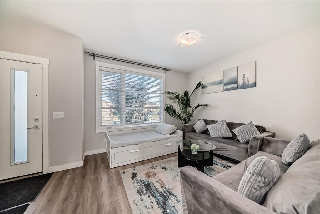 This immaculate and nearly new townhouse with NO CONDO FEES, is perfectly situated in a highly desirable area, this home is just steps away from schools, parks, grocery stores, banks, restaurants, and provides quick access to the airport and major roadways like Stoney Trail and Deerfoot Trail. The open concept main floor features a bright and spacious great room with a large picture window, filling the space with natural light. The modern rear kitchen boasts stainless steel appliances, a stylish tiled backsplash, a generous island with an eating bar, and quartz countertops. A rear patio door opens to a beautifully landscaped, west-facing yard, complete with a double detached garage. Upstairs, you'll find three well-sized bedrooms, including a master retreat with a private ensuite and walk-in closet. The convenience of upper-level laundry adds to the home's practicality. Enjoy the privacy of a fenced and landscaped yard and appreciate the quality finishings throughout. The full basement offers endless possibilities for your future development. This modern, high-quality home is located in a fantastic area, with a bus stop just steps away for easy commuting.