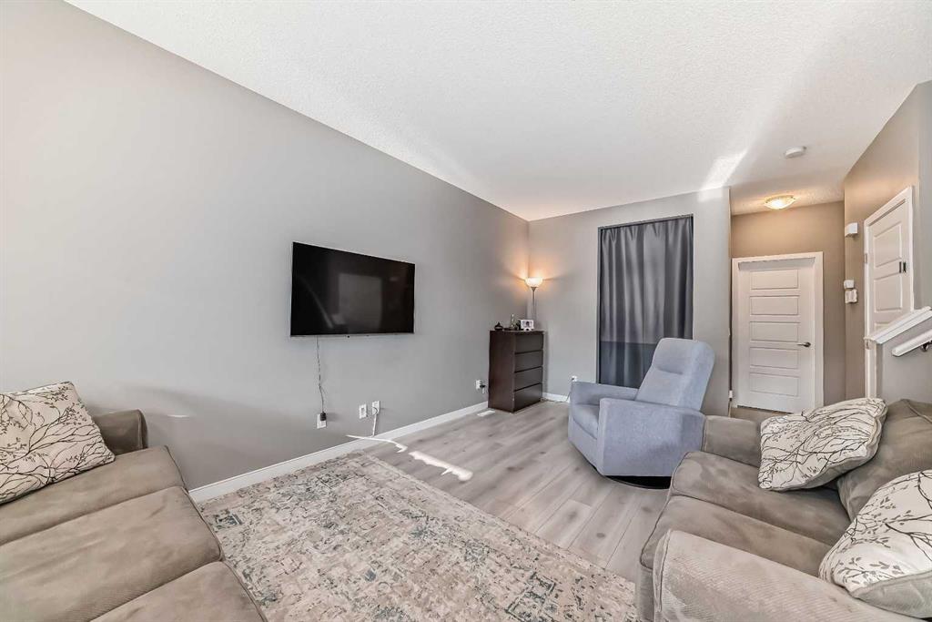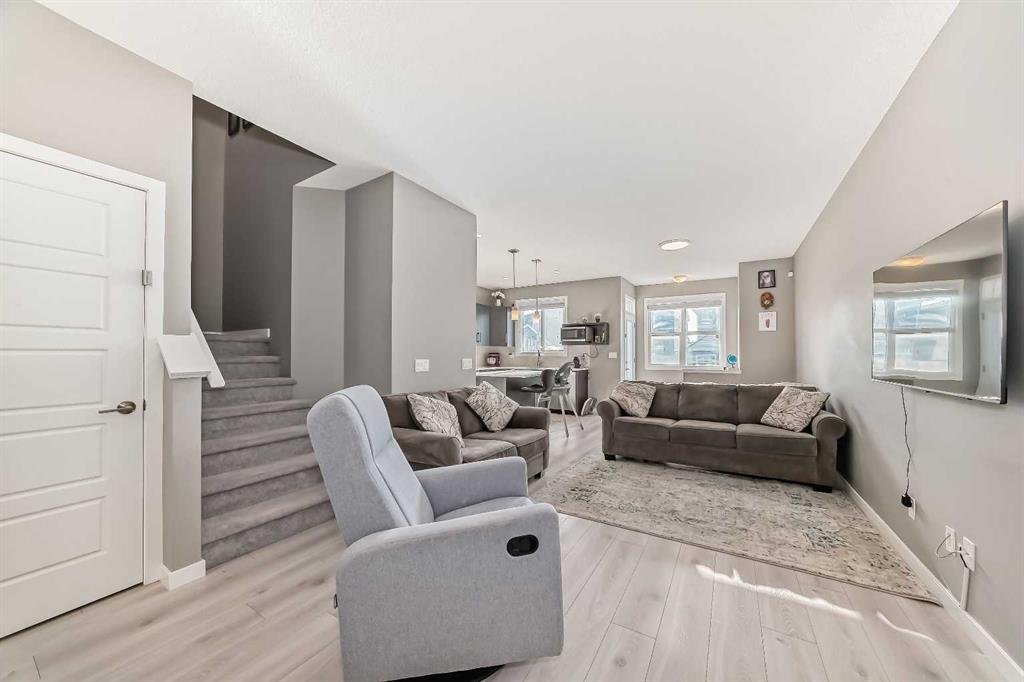 WELCOME TO THIS BEAUTIFUL TOWNHOUSE*NO CONDO FEES* This bright and modern 2 storey townhouse is in the much sought after community of CORNERSTONE. The home offers abundance of natural light with a vibrant open floor plan that flows smoothly into the functional kitchen with spotlights, QUARTZ COUNTERTOPS, a centralized island/eating bar and a walk-in corner pantry. The kitchen features stainless steel appliances, which include a French Door refrigerator w/icemaker, electric stove, hood fan and a microwave. The main floor includes a den, which can be used as an office space/kids activity room, and a 2-peice bathroom with an adjacent storage cabinet. The 2nd level offers a master bedroom with a private 5-piece en-suite bathroom and a walk-in closet along with 2 spacious bedrooms and a full 4-piece bathroom. The laundry room is conveniently located on the 2nd floor offering additional space. The unfinished basement comes with plumbing rough-in providing an opportunity for you to create and finish your ideal living space. Upgrades include a Glass Top Convection Range, MOEN Faucets, Canarm Designer Lighting, USB Charging Outlets & a Touchscreen Thermostat . The front and rear mud spaces have tiled flooring. The kitchen comes with a gas line for a future gas-range/cooktop and extends to a barbeque line on the deck. The backyard is beautifully fenced and gated for your privacy to enjoy your evenings and social gatherings. Love the most vibrant new community with restaurants, groceries, gas station, upcoming schools, parks, playgrounds, and transit within footsteps. Spanning over 1,000 acres in Calgary’s northeast, it’s a place for families at all stages of life to plant their roots. Call today to book your Private Showing.