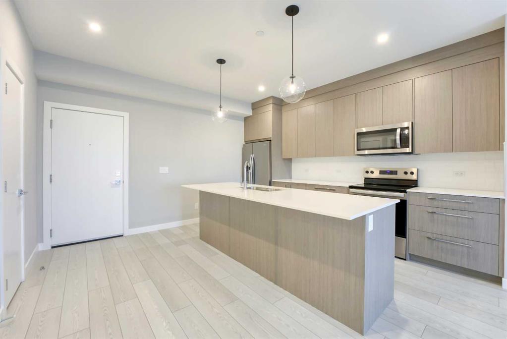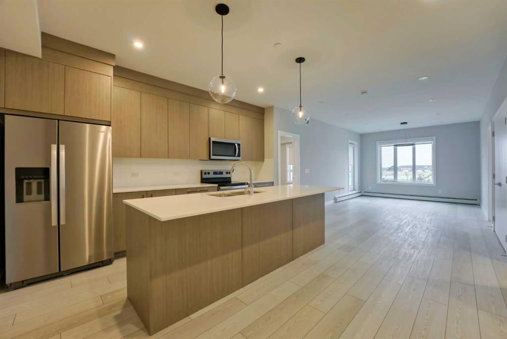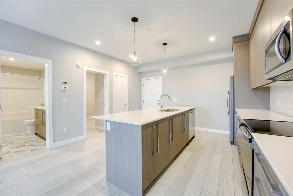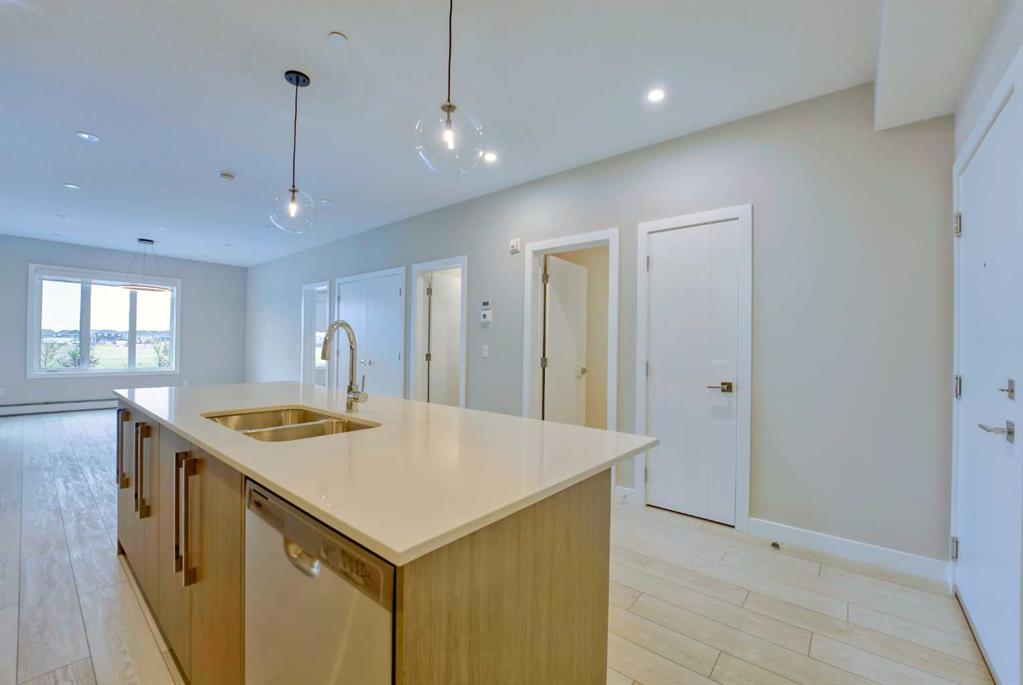 Public Remarks BRAND NEW | MODERNLY DESIGNED | 2 BEDROOM + A HUGE DEN | ACROSS FROM A PARK & AMENITIES | PRIVATE FLOOR PLAN SEPARATING THE BEDROOMS | GOURMET KITCHEN | OPEN FLOOR PLAN | WIDE PLANK FLOORING | WALK-THROUGH CLOSETS | DUAL SINKS | GLASS RAILED BALCONY WITH PARK VIEWS | IN-SUITE LAUNDRY | TITLED UNDERGROUND PARKING | SEPARATE STORAGE LOCKER | OUTSTANDING LOCATION! Brand new, modern and stylish 2 bedroom, 2 bathroom + a den condo across from a park and amenities! This ideal floor plan is bright and open with the principal rooms separating the bedrooms for ultimate privacy. The chic kitchen encourages culinary exploration featuring stainless steel appliances, full-height cabinets and a large breakfast bar island to gather around. Tranquil park views add to the relaxing atmosphere in the adjacent living room. Barbeque or unwind on the large balcony with glass railings so none of the beautiful views are obstructed. At the end of the day retreat to the primary oasis with walk-through dual closets that lead to the private ensuite boasting dual sinks, no need to share! The second bedroom is almost as luxurious with a walk-through closet also provides cheater access to the 4-piece main bathroom. The enclosed den could easily be used as a 3rd bedroom thanks to the closet and spacious size or as a substantial home office, hobby space or playroom. In-suite laundry and underground titled parking add to your comfort and convenience. Located in Skyview Ranch surrounded by big prairie sky pierced with city skyline and every amenity: shopping, schools, parks and a multitude of green spaces and pathways are right out the front door! Truly an unbeatable location for this exceptional unit with a perfect floor plan!