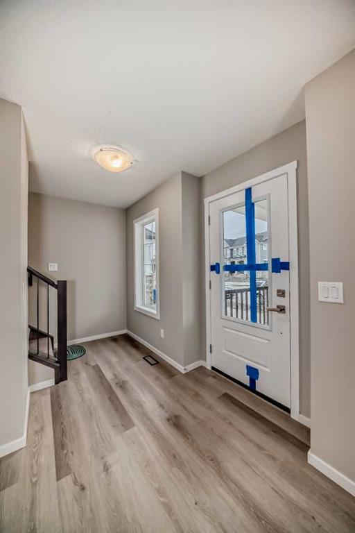 NO CONDO FEE, Newly Built, 2-car Rear Lane Townhouse, the largest unit on the street! This beautifully designed home boasts luxury vinyl plank flooring throughout the main level and features a modern, open floor plan with a dedicated dining area and a separate living room. The spacious kitchen is a highlight, complete with quartz countertops, top-of-the-line stainless steel appliances, and pot lights for added ambiance. The main floor also includes a convenient half bath and a double attached garage. Upstairs, you'll find a generous primary bedroom that serves as a true retreat, featuring a walk-in closet and a luxurious 3-piece ensuite. Two additional well-sized bedrooms, a full bathroom, and a laundry room complete the upper level, along with a good-sized family room for extra living space. The basement comes with a 3-piece plumbing rough-in, ready for your personal touch. Enjoy exclusive Architect’s Choice options, including knockdown ceilings, and more. This home offers access to planned schools, an environmental reserve, and a commercial complex, perfectly situated with easy access to Stoney Trail, Deerfoot Trail, the airport, shopping centers, and grocery stores. Don’t miss this extraordinary opportunity!