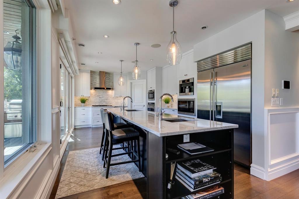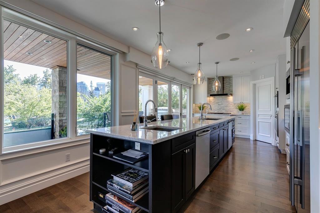 Encompassing the entire second floor with three bedrooms, den, and over 2,400 sq ft of developed living space, this exclusive rare boutique condo overlooks captivating views of the Bow River, Peace Bridge, and Downtown Core. Impeccable craftsmanship and intricate detailing is apparent the moment you step inside to a luxurious living space complete with hardwood floors, classic wainscotting, coffered ceilings, high-end finishings, and an open floor plan that ensures every main living space capitalizes on the breathtaking views. A sophisticated kitchen welcomes the home chef with marble counters and backsplash, expansive centre island, large walk-in pantry, and superior high-end appliances, including a built-in coffee maker! Effortlessly flowing off the kitchen is the open dining and living room with coffered ceilings and a marble surround linear gas fireplace for that perfect marriage of function and flow as you entertain family and friends. Enhance your indoor/outdoor entertainment space with two generous patios. The kitchen patio provides a stunning built-in BBQ while the living room patio offers gas hook-up for a fireable ensuring that no matter where you're choosing you're doing so under the downtown views/lights. This unit is the only one within the building that features three bedrooms! The serene primary retreat indulges with a massive custom walk-in closet, and lavish ensuite with a luxurious soaker tub and oversized marble tiled steam shower with rainfall shower head. Tucked away is a 2pc bathroom complete with dog wash station and laundry room. Take your private elevator down to your single garage and individual parking stall, making parking a breeze. This incredible inner-city condo offers optimal soundproofing, solar panels on the roof for energy efficiency, and built-in speakers. Located just steps to trendy Kensington, the Peace Bridge for quick access to the Downtown Core, the Bow River pathway, and the beautiful parks in Eau Claire. Urban living has never felt so luxurious as it does with this epic property.