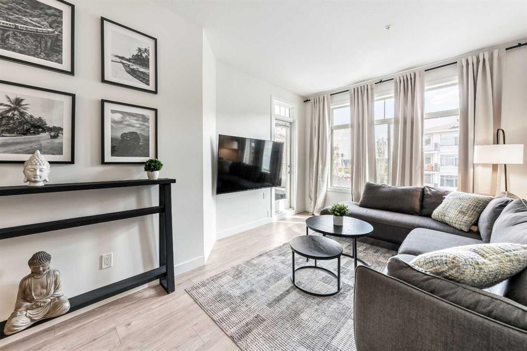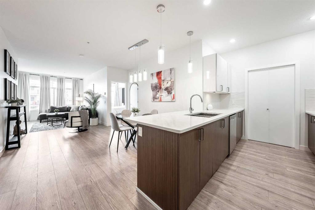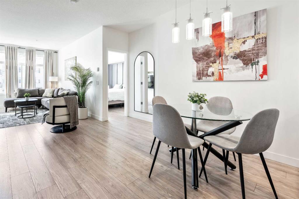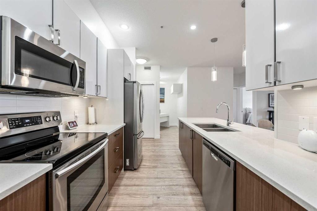This 2-BEDROOM + DEN/FLEX ROOM unit is in Stonecroft, with access to a LAKE and CLUBHOUSE in the Auburn Bay community. The open-concept layout spans over 942 square feet, providing ample space for comfortable living. The unit has 2 UNDERGROUND HEATED PARKING STALLS near the entrance for easy grocery unloading! Upon entry, you will be greeted by 9-foot ceilings, modern laminate flooring, and IN-FLOOR HEATING (included in the condo fee). The kitchen features stunning white cabinetry with soft close hinges, stainless steel appliances, upgraded lighting, pot drawers, a pull-down kitchen tap with a deep sink, and white quartz countertops. Both bathrooms boast a 4-piece ensuite with a soaker tub, quartz countertops, and ceramic tiled floors. The primary bedroom easily accommodates a King bedroom suite with a striking dark accent wall and a well-sized walk-in closet. The primary ensuite also features a sleek glass-walled shower. Laundry is conveniently tucked out of sight in the unit, past the kitchen. Step out onto the south-facing deck with a BBQ gas line and enjoy the view. The location is unbeatable, close to major transportation routes like Deerfoot Trail and Stoney Trail, yet it has all the conveniences one needs within walking distance. The South Health Campus, medical offices, a world-class YMCA facility with a public library, grocery stores, Cineplex theatre, banks, restaurants, and various shops are all just a short walk away, making this home perfect for first-time home buyers, investors, or healthcare workers as a walkable rental. This home offers a WELLNESS LIFESTYLE and is in high demand due to the inclusion of 2 underground parking stalls and an owner's locker for extra storage. The building is pet-friendly and suitable for all ages. Move in today and experience the convenience and comfort of this unit!