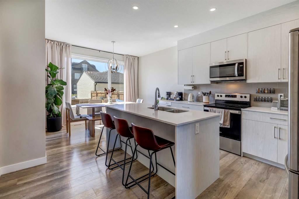 Welcome to this BUILT GREEN Certified home (meaning you get to enjoy a more durable, energy & cost-efficient & comfortable dwelling). This upgraded 4 bedroom; 3.5 bath townhouse is conveniently-located in one of NE Calgary's new & fast-growing communities. The spacious foyer leads you onto a 9-ft ceiling main floor with large windows in both the living & dining areas that allow natural lighting to brighten up the entire main level. The functional lay-out on the main & upper levels, as well as the fully-finished basement, makes every space well-utilized. The primary bedroom on the upper level has a 4 piece ensuite with double sinks, a stand-up shower & a spacious walk-in closet. There are 2 more good-sized rooms, a shared full bath and a laundry room, on this level. The basement was professionally developed thru the builders. It offers a flexible living quarter with a wet bar (mini-fridge included), a bedroom and a full bath. This home is fully-fenced & has low maintenance landscaping. There's also ample space for a future double garage in the current parking pad. Either as a primary residence or investment property, this home is very ideal for a young & growing family or for down-sizers, too. Come & view to appreciate & make it your next home or an addition to your investment portfolio!
