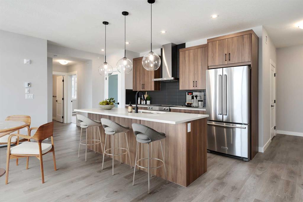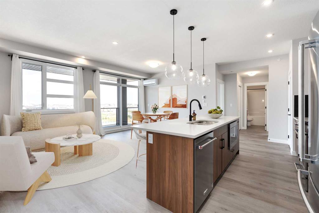 Public Remarks Welcome to unparalleled LUXURY nestled in the new community of Livingston, an great community gracing Calgary’s sought-after NW quadrant. Here, in the midst of urban sophistication, stands a BRAND NEW 1,016 sq ft TOP-FLOOR executive condo, a beacon of refined living and contemporary ELEGANCE. Offering 2 BEDS + 2 BATHS + TITLED UNDERGROUND PARKING STALLS (2 Tandem) + 1 STORAGE UNIT + Air Conditioning, this residence offers the EPITOME of modern comfort and style. The open floor plan beckons, effortlessly blending the kitchen, dining, and living areas into a HARMONIOUS sanctuary for everyday living and gracious entertaining. One of the crowning jewels of this condominium is its EXPANSIVE balcony, a serene OASIS offering VIEWS of the beautiful pond. Step inside, and be greeted by a symphony of LUXURIOUS touches and refined finishes. Light wood color LUXURY VINYL flooring stretches across the expanse, a timeless foundation upon which the rest of the space unfolds. The walls, adorned in a palette of understated elegance, serve as a backdrop for the unfolding drama of daily life. The kitchen, a CULINARY HAVEN fit for the most discerning chef, beckons with its sleek lines and modern amenities. HIGH-END stainless steel appliances and PREMIUM quartz countertops stand as testaments to both form and function, while PRISTINE modern cabinetry offers ample storage space for every culinary need. A stunning backsplash, intricately designed and artfully executed, serves as a focal point, infusing the space with a sense of CHARACTER & CHARM. Next to the dining area lies the entrance to the second bedroom, a versatile space offering endless possibilities. Whether utilized as a home office/gym or transformed into a welcoming guest retreat for visiting loved ones, this room embodies the essence of modern flexibility and convenience. A conveniently located 4-piece main bath stands ready to accommodate. Down the hall from the main entrance, a discreet doorway grants access to the in-suite laundry facilities, seamlessly blending utility with elegance. The living hall, a corridor of possibilities and hidden wonders, leads to the luxurious PRIMARY RETREAT that offers a private escape from the cares of the world, a haven of comfort and tranquility. With access to the EXPANSIVE BALCONY from the main living area, residents are invited to bask in the splendor of outdoor living. The primary ensuite offers a luxurious escape from the rigors of daily life. Luxurious dual vanities with quartz countertops, spacious modern glass shower & HUGE walk-in closet are meticulously crafted and elegantly appointed. Discover the charm & excitement of Livingston, one of Calgary’s most sought-after new communities, designed with modern living and lifestyle in mind. Located in the heart of Calgary’s thriving North-West, Livingston offers a seamless blend of urban conveniences, scenic landscapes, and a strong sense of community. CALL TODAY to book your PRIVATE TOUR!!