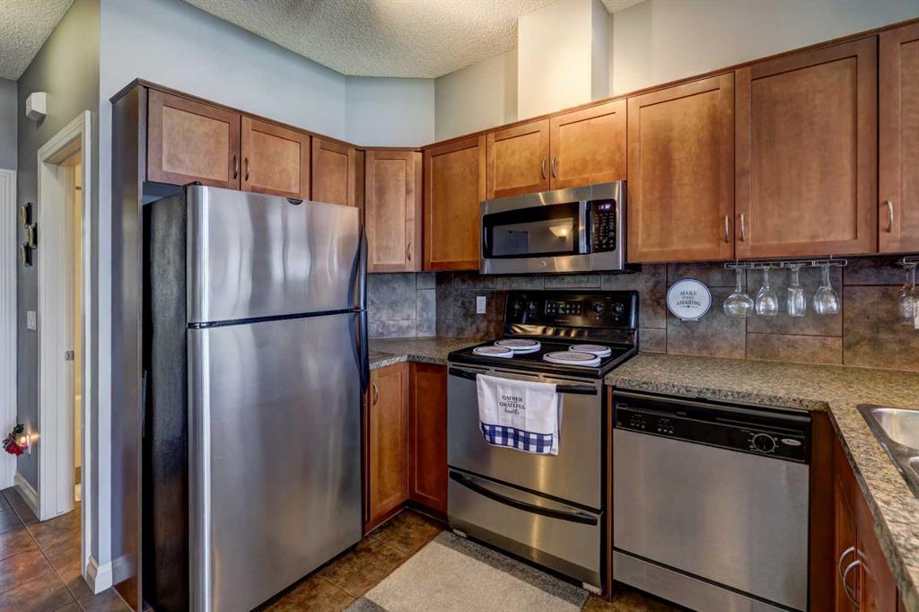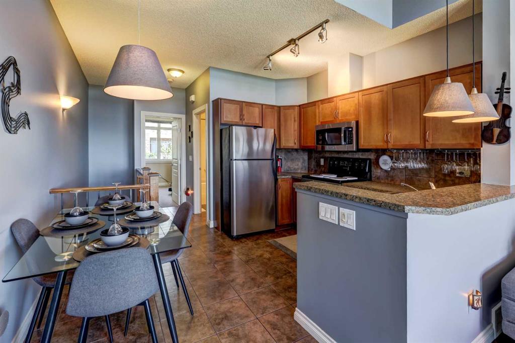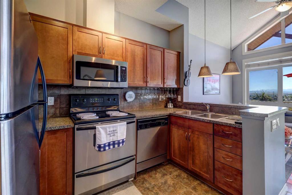 ****PUBLIC OPEN HOUSE NOV 9, 2024; 2-430 pm*** ENJOY THE UNOBSTRUCTED MOUNTAIN VIEWS FROM YOUR LIVING ROOM, DECK AND MASTER BEDROOM IN THIS IMMACULATE "BLUE SKY of ROCKY RIDGE" CONDO. See the seasons change without leaving home. You will Love the Gorgeous Two storey, two Bedrooms and Two Bathrooms. This Lovely home gives a very contemporary feel. You can enjoy your morning Coffee or afternood Tea on your own deck. YOUR DECK IS ADORNED WITH ALUMINUM RAILING AND WATERPROOF DECK FLOORING. ENJOY the Very Tranquill view of the Treed Ravine. Spectacular Living room with 13 foot Vaulted Ceiling PLUS Fabulous Hand Scraped Engineered Hardwood Floor. The Living room is also open to the KItchen and Dining Room which has Ceramic Tiled Flooring. Track lighting in the Kitchen. Lots of 9 foot ceilings. The Kitchen is enhanced with a mini unused unique Eating Bar. The Open Style Kitchen is graced with beautiful Warm Maple Cabinets. TWO Built in Multi Glass Wine Racks. Nice Kitchen Faucet. Kitchen is Equipped with Top Quality Stainless Steel Appliances including a Vented Microwave/Hoodfan. Double Stainless Steel Sink with Built in Garburator. This level also features a 4-pce Bathroom with Modern Curved Shower Curtain Rod, and 2nd Bedroom. The Large Primary/Master Bedroom Level also Features Newer Private 3-pce Ensuite with Sliding Glass Door and One-piece Surround.This main floor also is enhanced with a main floor open Den; Closeted Laundry with NEWER FRONT LOAD Washer & Dryer and the Utility Room with a Newer Hot Water Tank. This home also features Three Ceiling fans for Enhanced Air Circulation. This home also includes wrought iron spindles on the staircase. Superbly Located Close to Major Shopping including Co-op Centre Rockyridge. THE FITNESS CENTRE is ON YOUR LEFT; as you enter the Complex, it is mere steps away. There is also a Titled Undergroung Heated Parking and Storage. Easy Access to Crowchild Trail, Calgary Ring Road (Stoney Trail) and The LRT. Quick get away to the mountains. You Must view For Full Appreciation.
