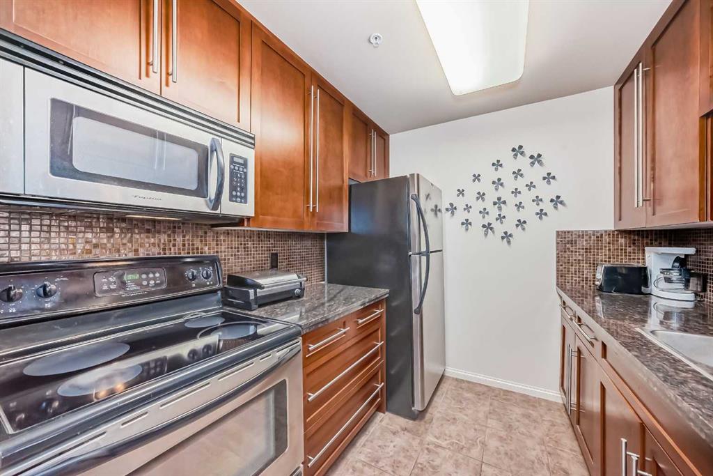 Unbeatable location! Welcome to Aurora At Chinook. A great opportunity for first time home buyer or an investor. The spacious one bedroom condo features a well appointed kitchen with granite counter tops and stainless steel appliances. The large dining/ living area features a cozy gas fireplace and a door leading to the south facing deck with a gas hookup for your BBQ. The private deck overlooks a beautiful courtyard. The primary bedroom has a walk through closet leading to the 4-pc bathroom. Insuite laundry completes the space. This unit comes with a titled underground parking stall and large storage locker. A very well maintained building close to all major routes such as Deerfoot, Glenmore, Elbow and Crowchild. Walking distance to Chinook centre and the many restaurants and shops of Macleod Trail. Steps away from public transportation. Don’t miss this opportunity and call for your viewing today!