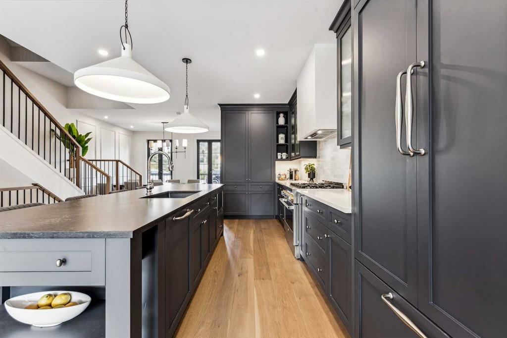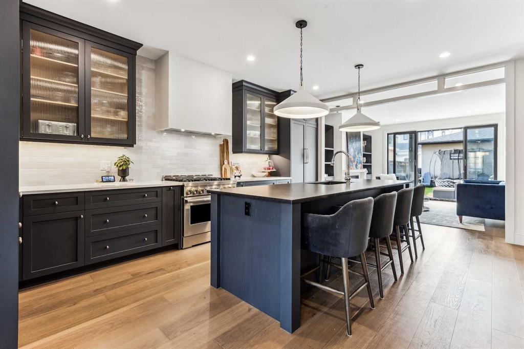 This spacious home offers large square footage (over 3500 sq ft of fully finished living space), multiple bedrooms, and a blend of elegance and contemporary style that defines today’s luxury standards. From the luxurious finishes to the remarkable “cool factor,” this home exudes sophistication and offers a unique experience in every room. With mid-century modern flair, you'll immediately notice the exquisite colour palette, carefully selected and designed to create a warm and inviting atmosphere. The attention to detail is evident in every corner, from the elegant finishes to the clean lines and open spaces that define the home. Moving through the main living area, the seamless flow between spaces is ideal for everyday living and entertaining. The chef's kitchen is a showstopper with high-end appliances, sleek cabinetry, and a spacious center island, perfect for casual meals or hosting guests. Floor-to-ceiling windows allow natural light to flood the space, connecting the indoors with the outdoors and offering easy access to the sunny south-facing patio and yard. As you head upstairs to the second floor, you'll find 3 bedrooms, two with private ensuites and walk-in closets. On the third level, the master suite is nothing short of a sanctuary, with extra windows to take in the stunning city views, a custom-designed walk-in closet, and a spa-like ensuite featuring a deep soaker tub, dual vanities, and a spacious shower. Step out onto the rooftop patio for your morning coffee or a relaxing evening with the city skyline as your backdrop. The fully finished basement invites you to discover even more living space, perfect for family gatherings or movie nights in the rec room, complete with a wet bar. A glass-enclosed gym offers a private space to work out, while a fifth bedroom and full bathroom provide additional room for guests. The extra-deep backyard with a sunny south-facing patio is your private oasis, and behind is the double detached garage wired for electric vehicles. Situated in the highly sought-after neighbourhood of West Hillhurst with easy access to river pathways, Edworthy Park, Kensington, and a wealth of restaurants, cafes, and Shops— Close to Foothills Hospital, Tom Baker Cancer Centre, U of C, and SAIT. This home is not just about aesthetics—it's about the feel of the quality. Every room has been designed with intention, purpose and care, creating a sense of elegance that must be experienced to be fully appreciated. This home offers an unparalleled living experience that will leave a lasting impression in a spectacular location!
