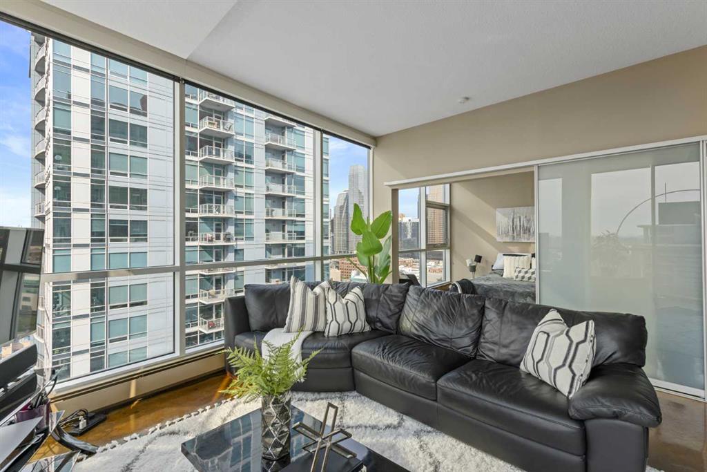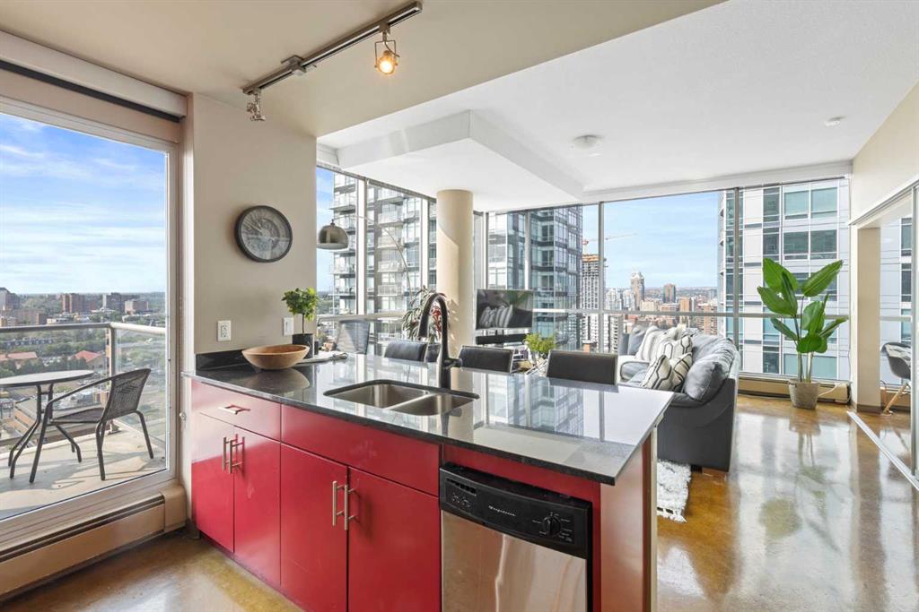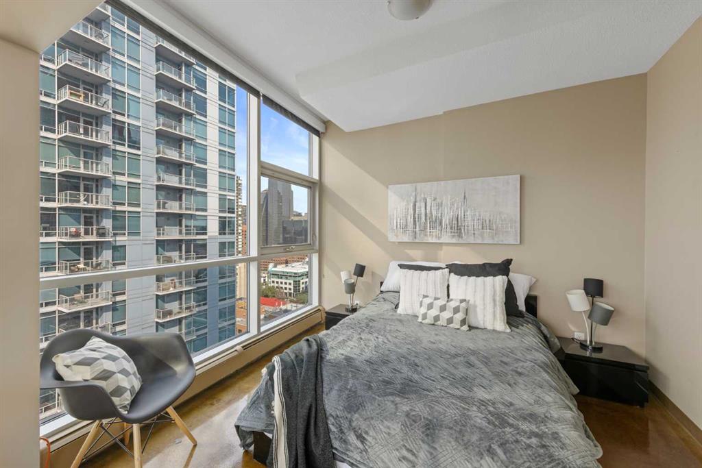 Enjoy stunning MOUNTAIN views, central AC, and an ideal location in this 1-bed, 1-bath condo with a functional, open-concept layout. The living area boasts floor-to-ceiling windows with remote-controlled blinds, a built-in office nook, and polished concrete floors. The kitchen features stainless steel appliances, a brand new microwave range hood, and balcony access. The bedroom also has floor-to-ceiling windows, a walk-in closet with stacked washer and dryer, and an ensuite with a stand-up shower, soaker tub, and stone countertops. Included is one titled parking stall and building amenities like a communal patio, recycling bins, bike storage, plus it’s pet friendly with board approval. Centrally located, it's within walking distance to 17th Ave, Stampede Park, the C-Train, and various shopping, dining, and nightlife options.